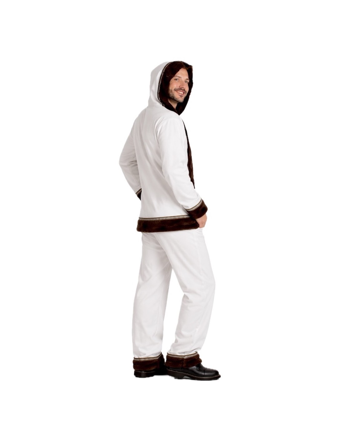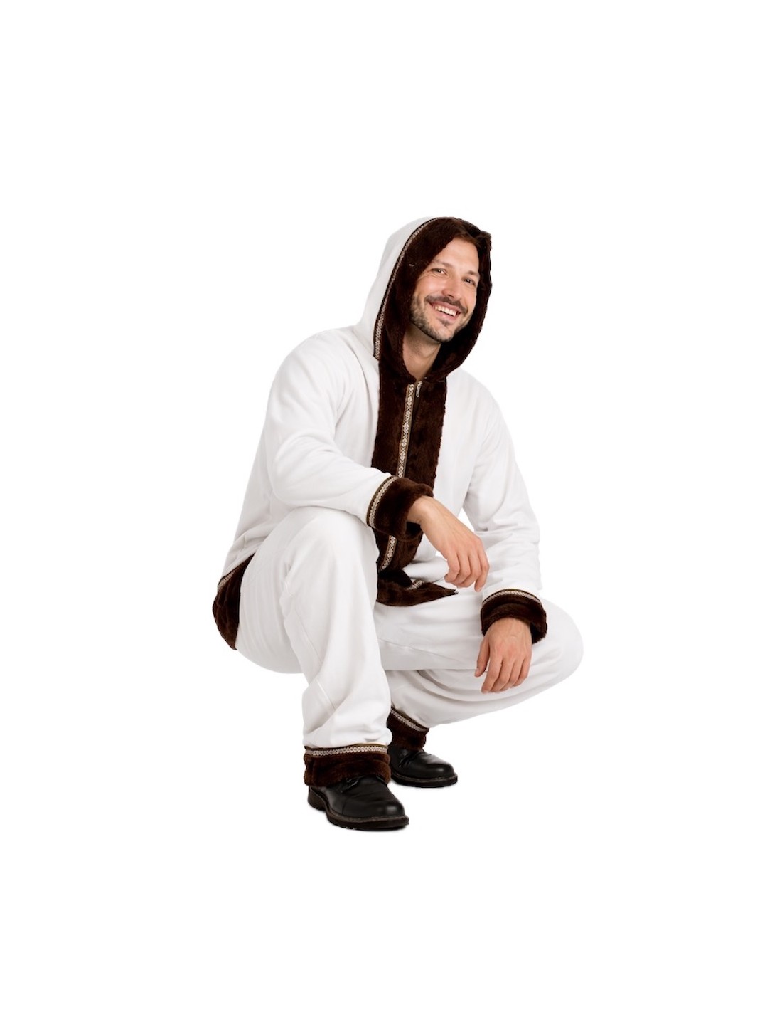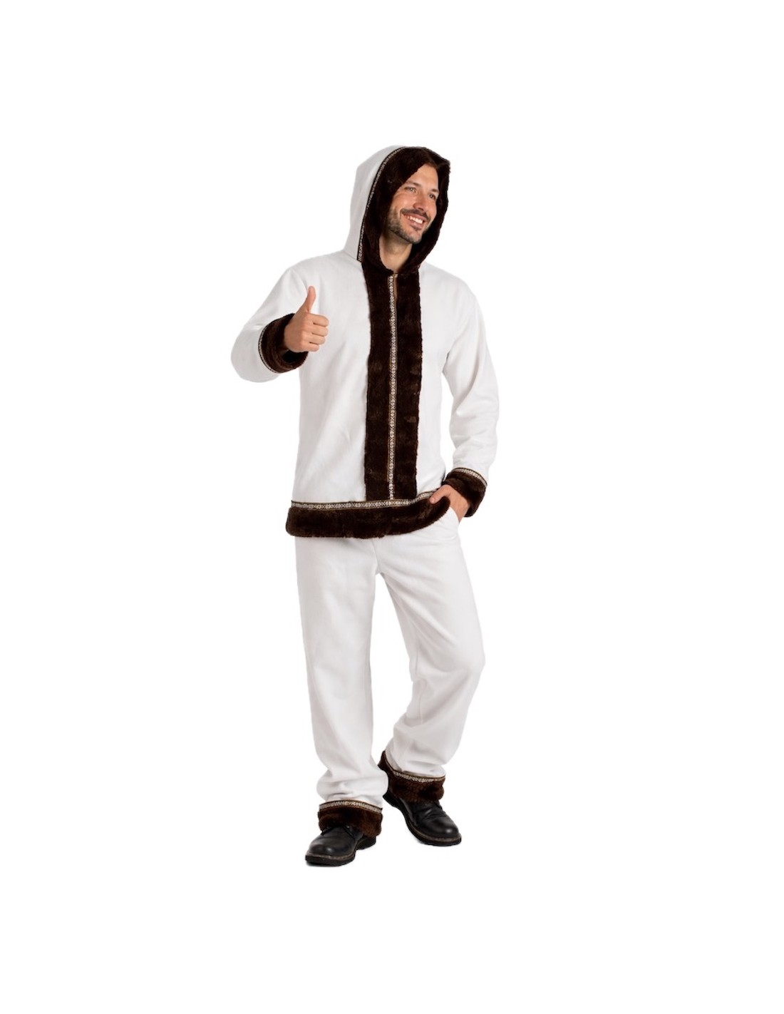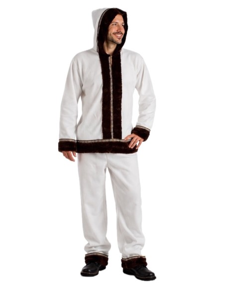 Authentic and warm Eskimo costume for adults, consisting of a long jacket with an integrated hood, made of ultra-soft plush fabric that is very pleasant to the touch. Decorated with elegant velvet details on the cuffs, hood, central part, and hem, both in the front and back, and enhanced with a colorful ribbon with Sami print. The pants, with an elastic waistband and an inner pocket, include the same decorations at the hem to harmonize the outfit. A design faithful to traditional attire, of high quality, and impeccable finish.