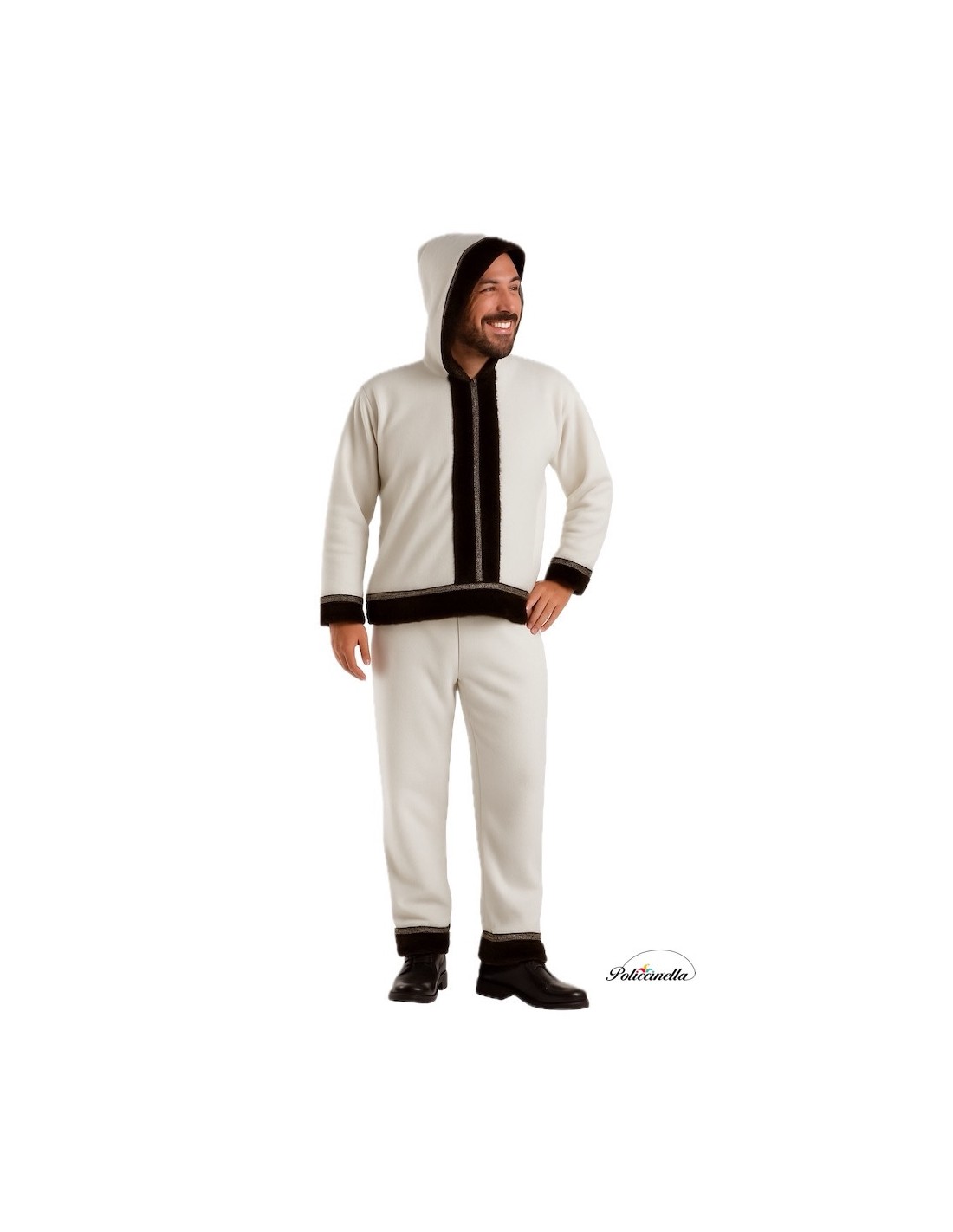 Authentic and warm Eskimo costume for adults, composed of a long jacket with an integrated hood, made of ultra-soft and very pleasant plush fabric. Decorated with elegant velvet details on cuffs, hood, central part, and hem, both front and back, and enhanced with a colorful ribbon with Sami print. The pants, with elastic waistband and interior pocket, include the same decorations on the hem to harmonize the outfit. A design faithful to the traditional attire, of great quality and impeccable finish.