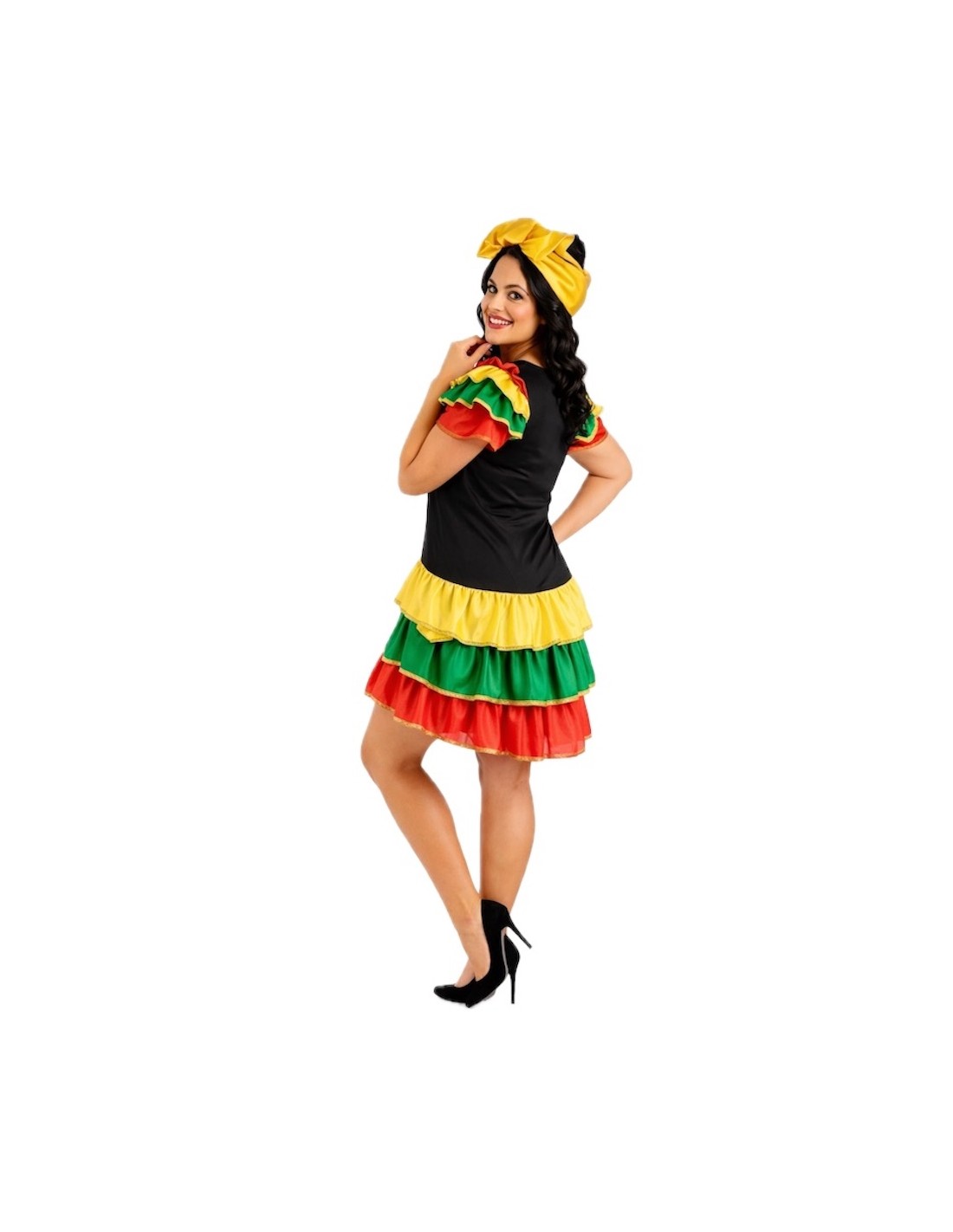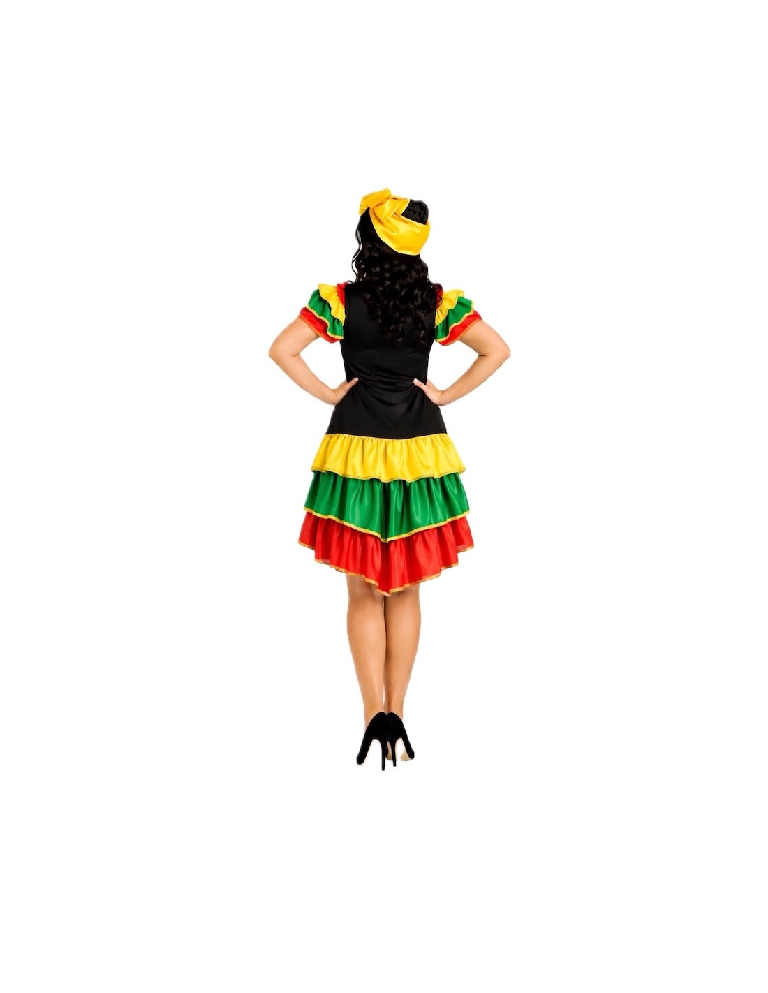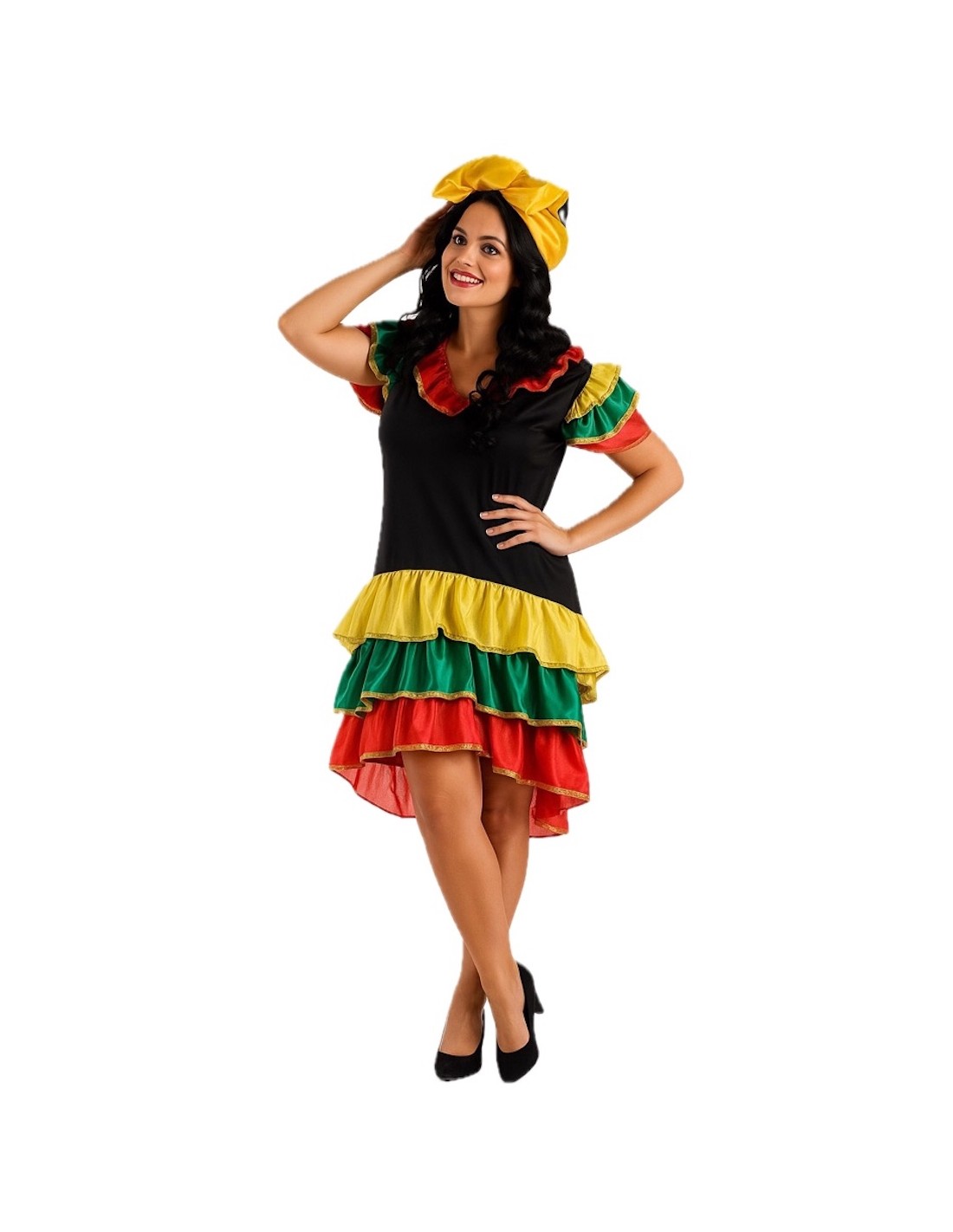Colorful and elegant rumba costume composed of a straight-cut dress with an asymmetrical hem, longer at the back, made of soft semi-elastic machine-knit fabric. Light, comfortable, and flattering, it is decorated with cheerful ruffles on the neckline, sleeves, and hem, made of soft satin in bright colors and finished with golden ribbons. Includes a matching headscarf in the same fabric as the ruffles. A showy design that is adjustable to different sizes, ideal for parades, performances, Carnival, or parties full of rhythm and joy.