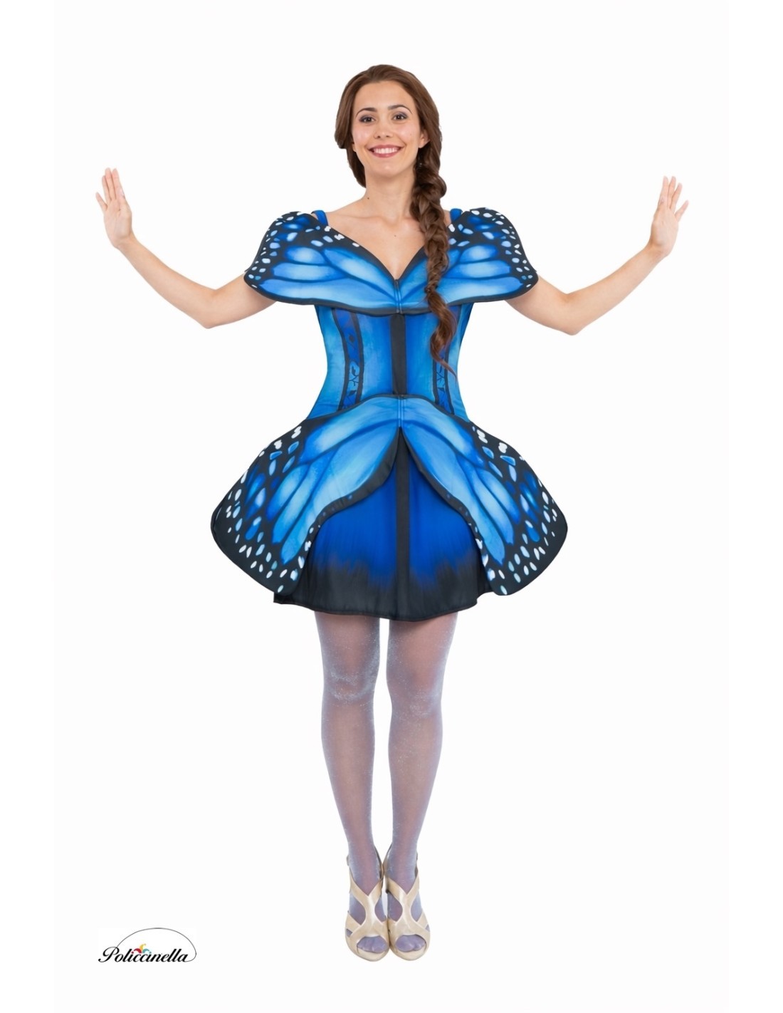 This costume, made with machine-knitted fabric featuring a digitally printed design in a range of blue tones, includes wings inspired by those of a butterfly at shoulder and hip height. These wings, crafted from a felt piece adhered and covered with the same fabric as the dress, provide rigidity to the garment without sacrificing its elasticity, allowing them to maintain their structure and shape.