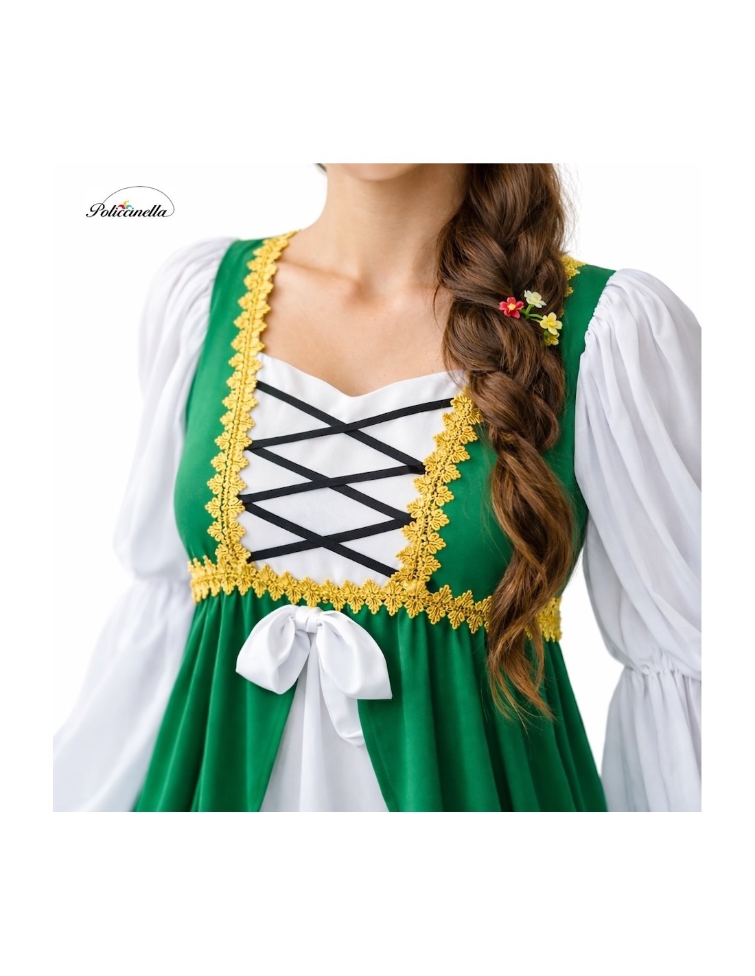This elegant medieval costume for women stands out for the quality of its tailoring and the beauty of its design. The bodice, made of soft semi-elastic knit fabric, fits comfortably to the figure and is richly decorated with ribbons and gold trim, giving it a noble and distinguished look. From it, a two-layer skirt with a beautiful flowery design flows, providing movement and enhancement to the ensemble. The waist is adorned with delicate petals that stylize the silhouette and add an original touch. The sleeves, long and puffy, have elastic at the elbow for an elegant and comfortable fit. The dress closes discreetly at the back with an invisible zipper, ensuring a flawless finish. A high-quality costume, ideal for performances and themed parties with a medieval style.