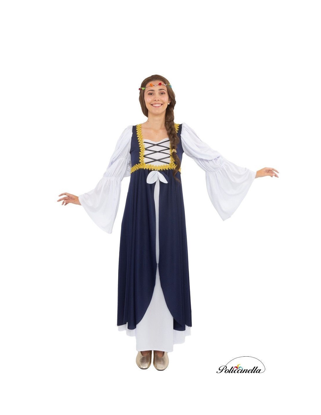 This elegant medieval costume for women stands out for the quality of its craftsmanship and the beauty of its design. The body, made of soft semi-elastic machine-knit fabric, fits comfortably to the figure and is richly decorated with ribbons and golden trimmings, giving it a noble and distinguished look. From it, a two-layer skirt with a nice flare begins, providing movement and enhancing the ensemble. The waist is adorned with delicate petals that stylize the silhouette and add an original touch. The long, puffy sleeves have elastic at the elbow for an elegant and comfortable drape. The dress closes discreetly at the back with an invisible zipper, ensuring a flawless finish. A high-quality costume, ideal for medieval-themed performances and parties.