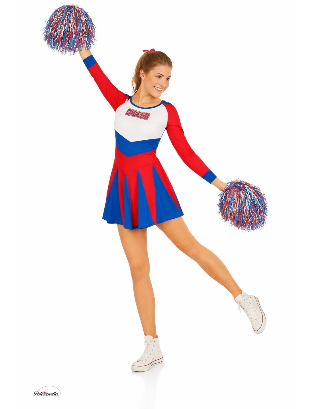 Energy and style in every movement! This striking cheerleader costume includes a short dress in vibrant red, blue, and white colors, with a waist cut and a flowing skirt that adds dynamism. Made of soft semi-elastic machine-knit fabric, it offers comfort and freedom of movement to cheer without limits. The design features the word CHEER on the chest, adding an authentic and sporty touch. Ideal for theme parties, parades, or school events, its lightweight fabric adapts to the figure enhancing the silhouette for a result full of energy and enthusiasm.