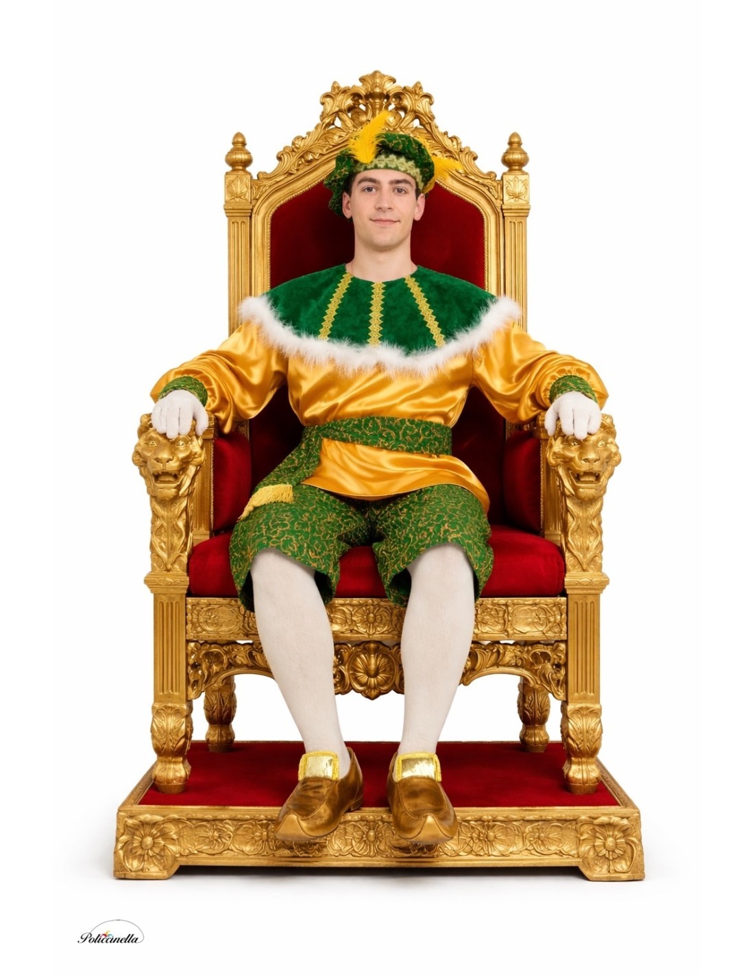 A colorful and distinctive costume, perfect for parades and celebrations. It includes a puffy cap made of festive chiffon fabric with printed golden designs, adorned with braiding and a yellow feather that give it a princely air. The golden satin jacket is complemented by a bib of soft green velvet, decorated with golden braiding and trimmed with delicate white boa, with a Velcro closure at the neck. The bloomers, made of the same festive chiffon, have elastic at the waist and under the knees for added comfort. The ensemble is completed with a matching sash, decorated with elegant fringes, and foam slipper-style shoe covers that maintain their shape and offer a flawless finish.