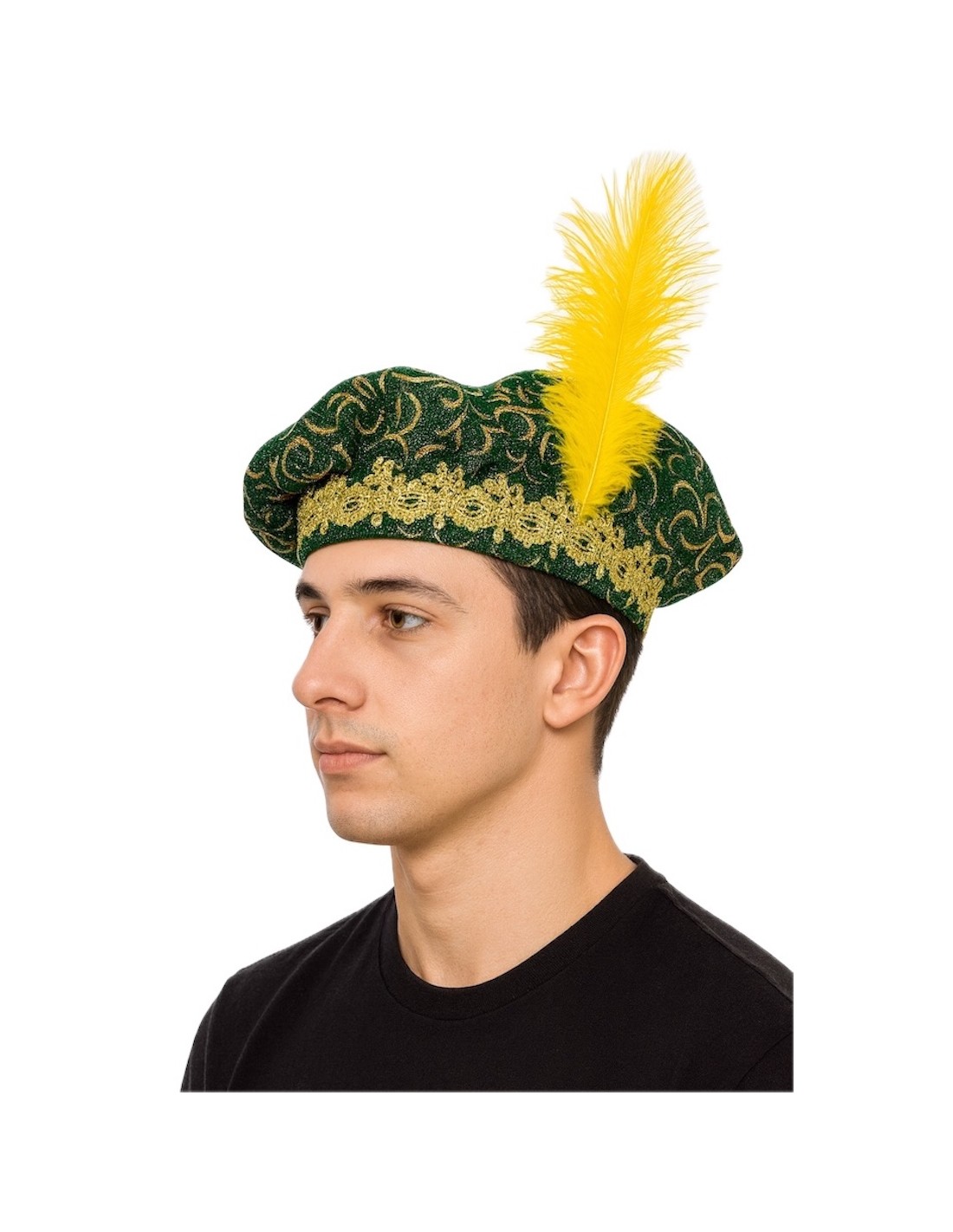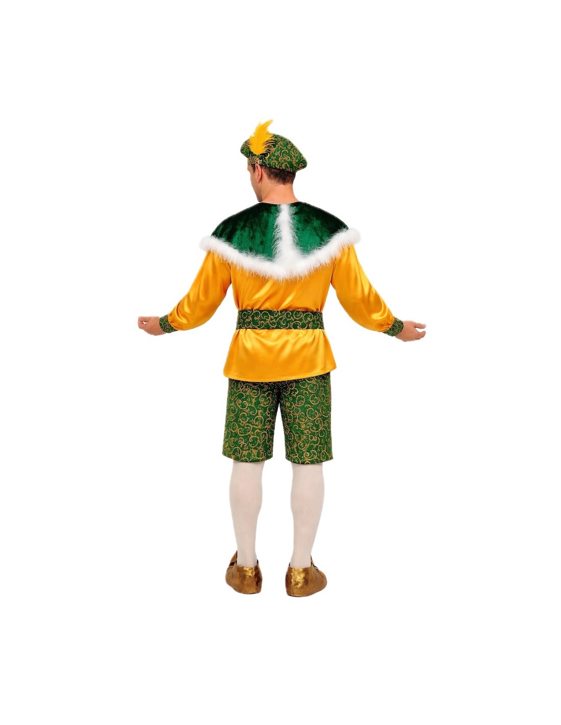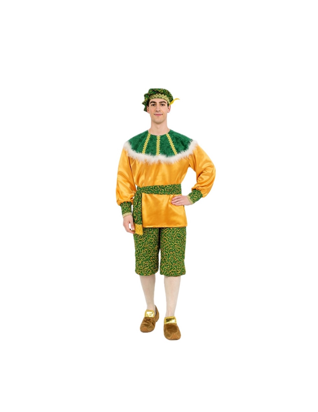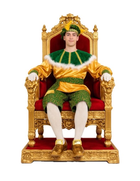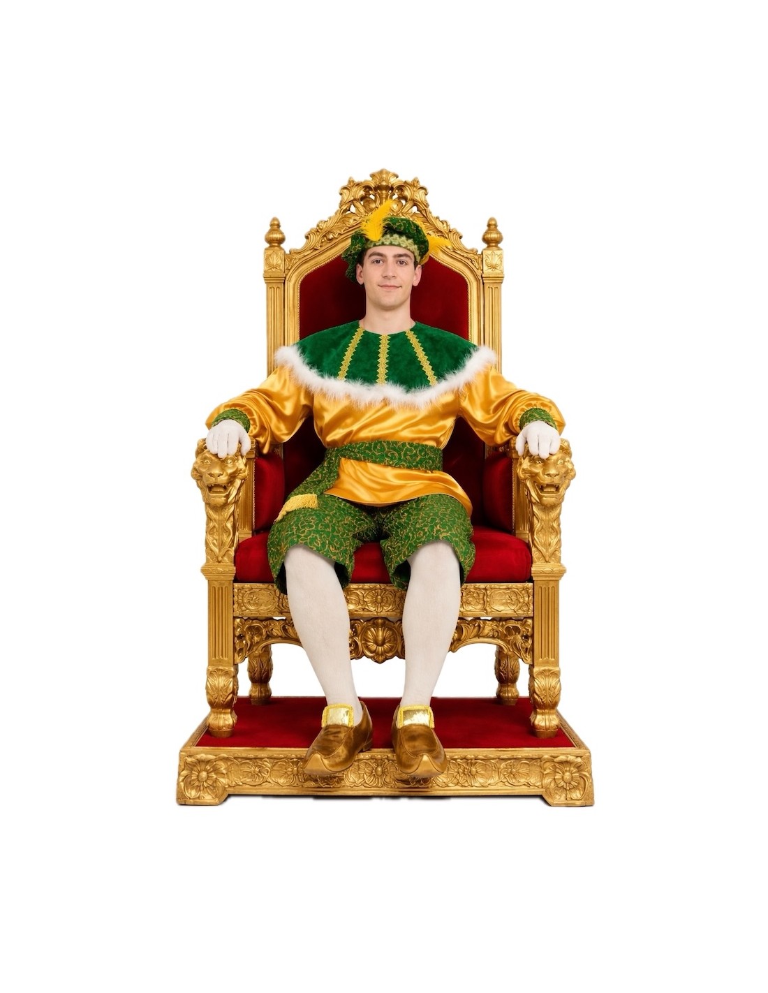 A colorful and distinctive costume, perfect for parades and celebrations. It includes a puffy cap made of festive chiffon fabric with golden printed designs, adorned with trimmings and a yellow feather that gives it a princely air. The golden satin jacket is enhanced with a bib made of soft green velvet, decorated with golden trimmings and edged with delicate white boa, with a Velcro closure at the neck. The baggy pants, made of the same festive chiffon fabric, have an elastic waistband and elasticized cuffs for added comfort. The ensemble is completed with a matching sash, decorated with elegant fringes, and foam slippers that maintain their shape and offer a flawless finish.