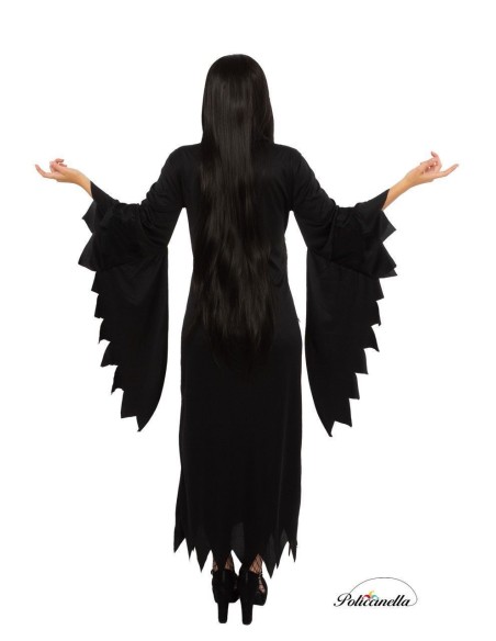 This dress, made of semi-elastic machine-knit fabric, features a sweetheart neckline with a lapel collar and a front opening that goes down to the knee. The half-length sleeves have an over-sleeve that reaches almost to the ankles. The dress has a seam below the chest to enhance the figure and comes with a belt that adjusts to the waist with a velcro system.