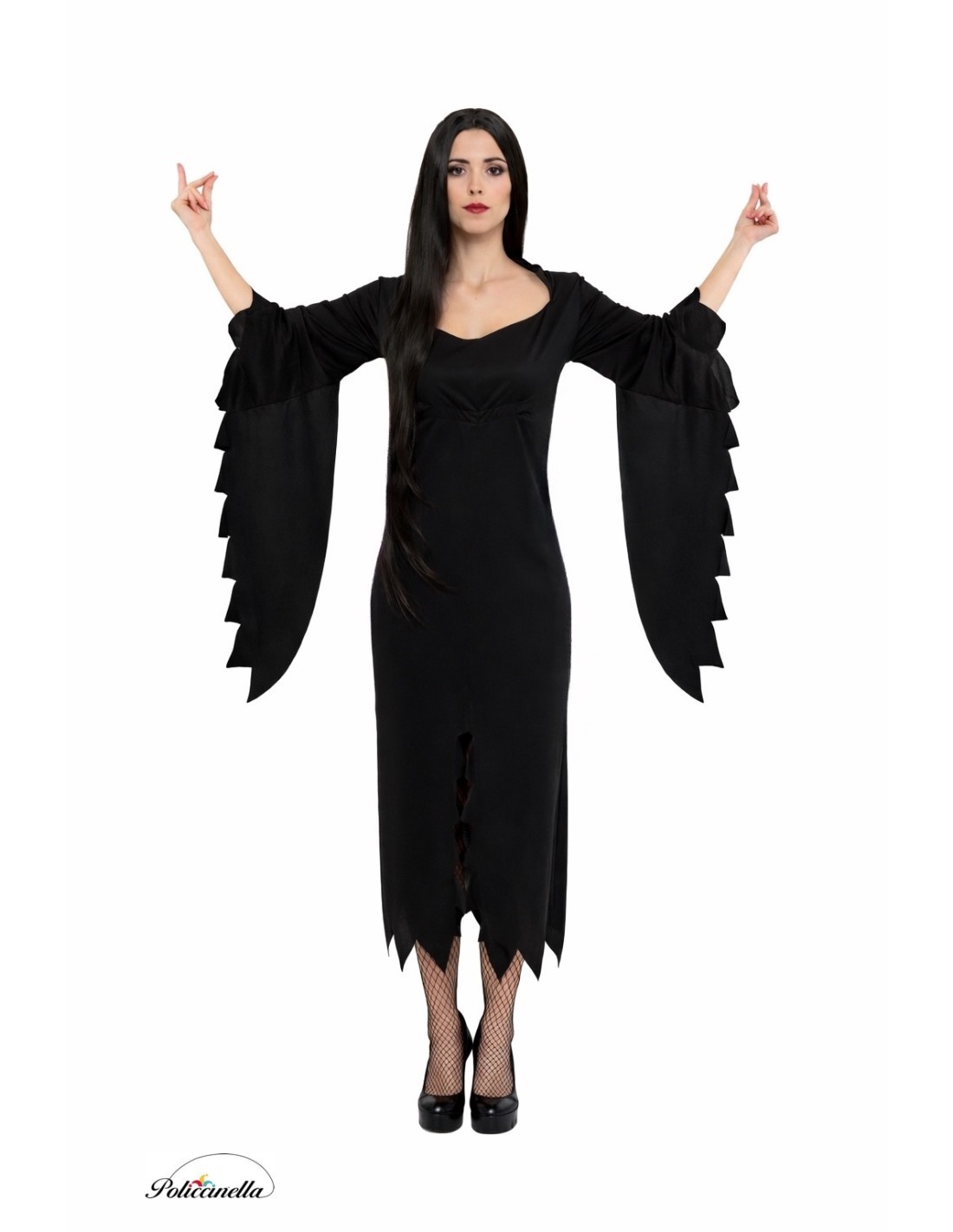 This dress, made of semi-elastic machine-knit fabric, features a sweetheart neckline with a lapel collar and a front opening down to the knee. The mid-length sleeves have an overlay that reaches almost to the ankles. The dress has a seam under the chest to enhance the figure and comes with a belt that adjusts to the waist using a velcro system.