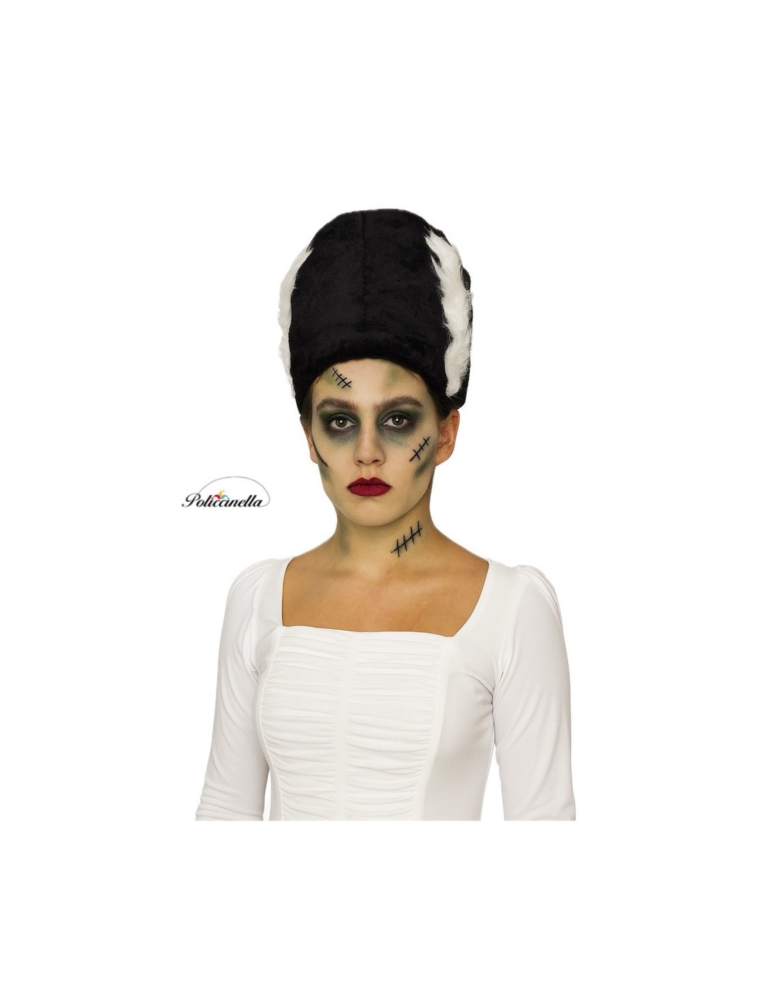 Elegant and spectacular Bride of Frankenstein costume, consisting of a long dress with a great fall, made of soft machine-knit fabric. It features delicate draping in the center and on the sleeves, with a box neckline and straight cut that stylizes the figure. The skirt has a soft flow, while the back elastic, from armhole to armhole, offers great adaptability, covering sizes from 36 to 44. The back stands out for its impressive cape-like sleeves, which fall from the shoulders to the floor, adding a ceremonial and unique touch. Additionally, it includes an adjustable wig-cap!!!, an added bonus that completes the characterization perfectly.