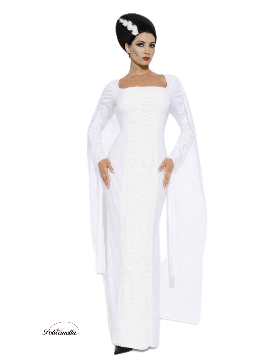 Elegant and spectacular Bride of Frank costume, consisting of a long dress with a great fall, made of soft machine-knit fabric. It features delicate draping in the center and on the sleeves, with a box neckline and a straight cut that stylizes the figure. The skirt has a soft flow, while the elastic band at the back, from armhole to armhole, offers great adaptability, covering sizes from 36 to 44. The back is highlighted by its impressive cape sleeves, which fall from the shoulders to the floor, providing a ceremonious and unique touch. Additionally, it includes an adjustable wig cap!!!, an added bonus that completes the characterization perfectly.