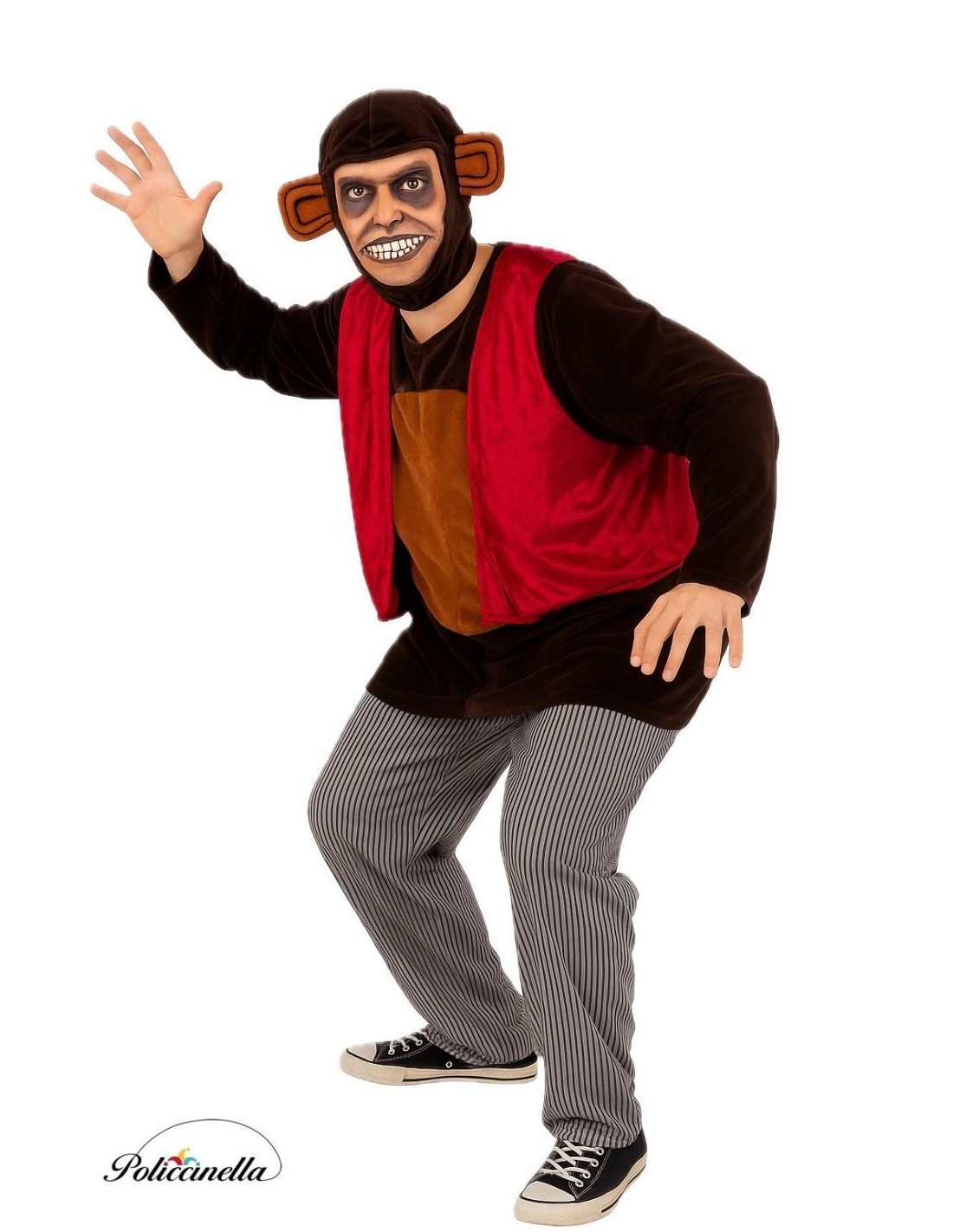 Disturbing and sophisticated, this costume faithfully recreates the sinister ape. It includes a velvet hood with integrated ears, a shirt with Velcro closure at the neck, a soft velvet vest, and machine-knit pants with an elastic waistband and inner pocket. Every detail evokes the disturbing presence of the killer monkey, ideal for those seeking a striking, comfortable outfit filled with cinematic tension.