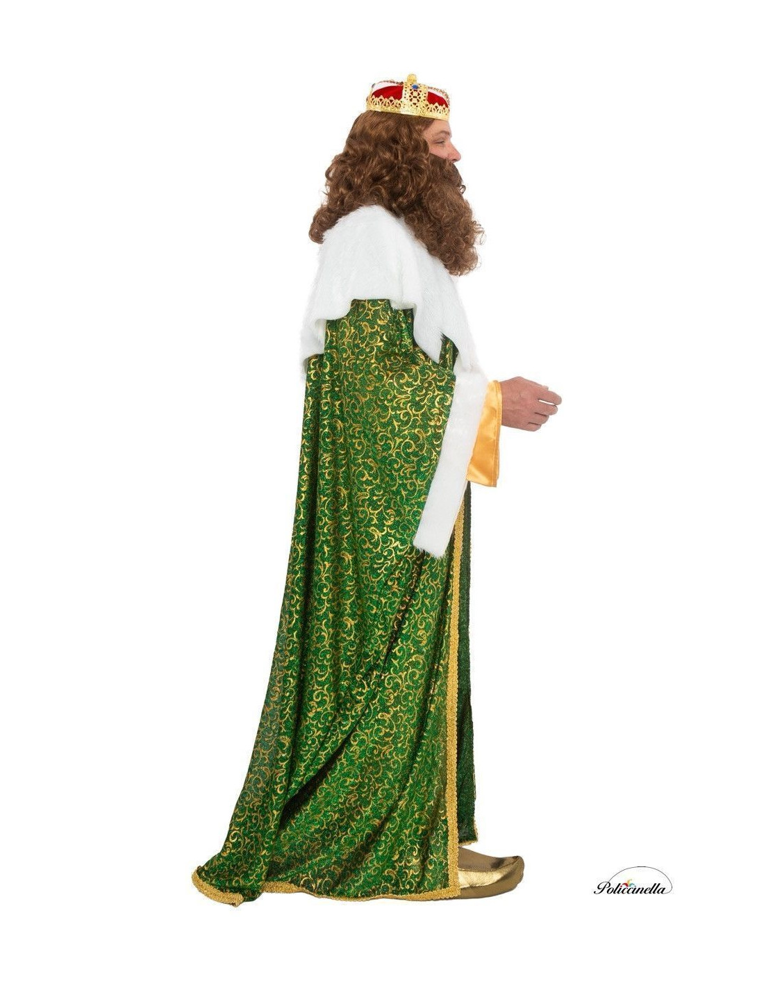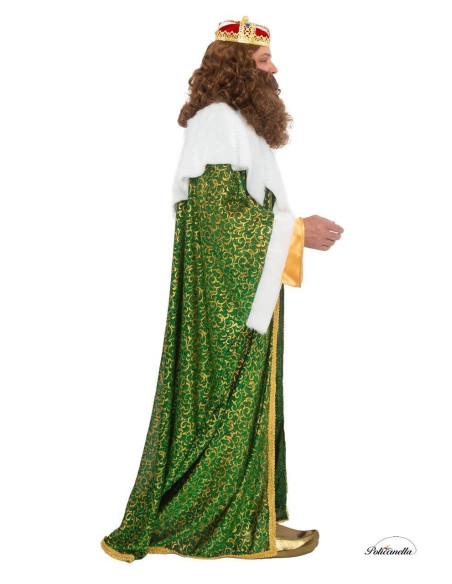Stand out with distinction in this splendid costume of King Gaspar, ideal for parades and royal representations. The long golden coat, made of polyester, closes at the neck and is combined with an imposing green cape with golden print, finished with a collar and cuffs of semi-curled white fur. The matching sash, adjustable with Velcro, enhances the silhouette and adds a regal touch, while the golden slippers complete the ensemble. A costume that combines elegance, tradition, and a majestic presence in every detail.