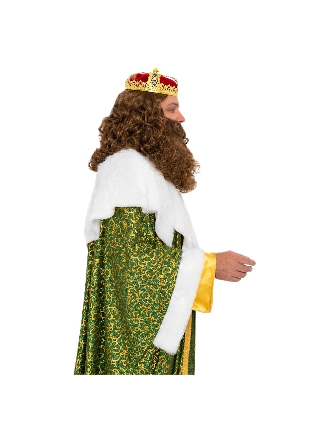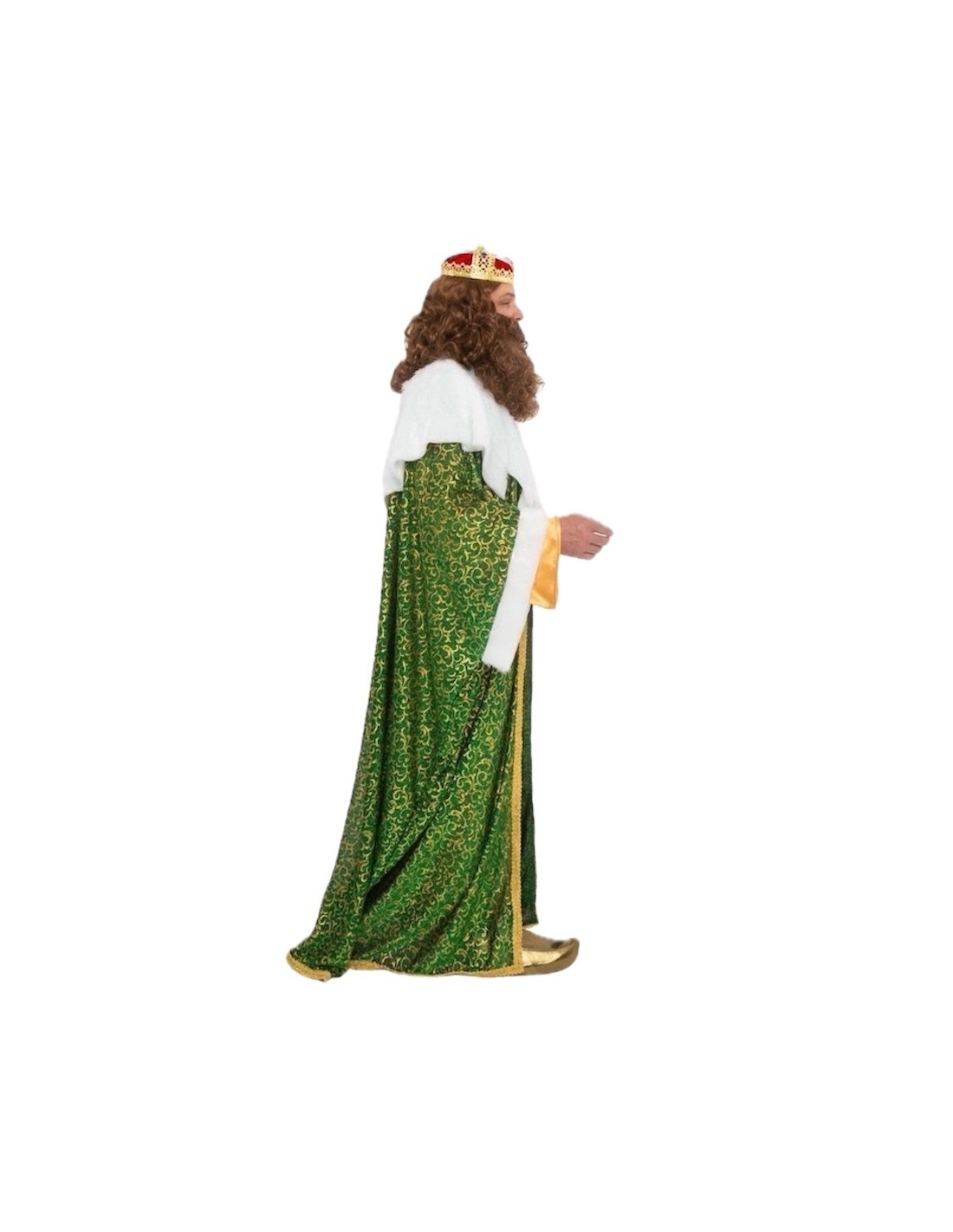 Stand out with distinction in this splendid costume of King Gaspar, ideal for parades and royal representations. The long golden jacket, made of polyester, closes at the neck and is combined with an imposing green cape with golden print, finished with a white semi-curly fur collar and cuffs. The matching sash, adjustable with velcro, enhances the silhouette and adds a regal touch, while the golden slippers complete the outfit. A costume that combines elegance, tradition, and majestic presence in every detail.