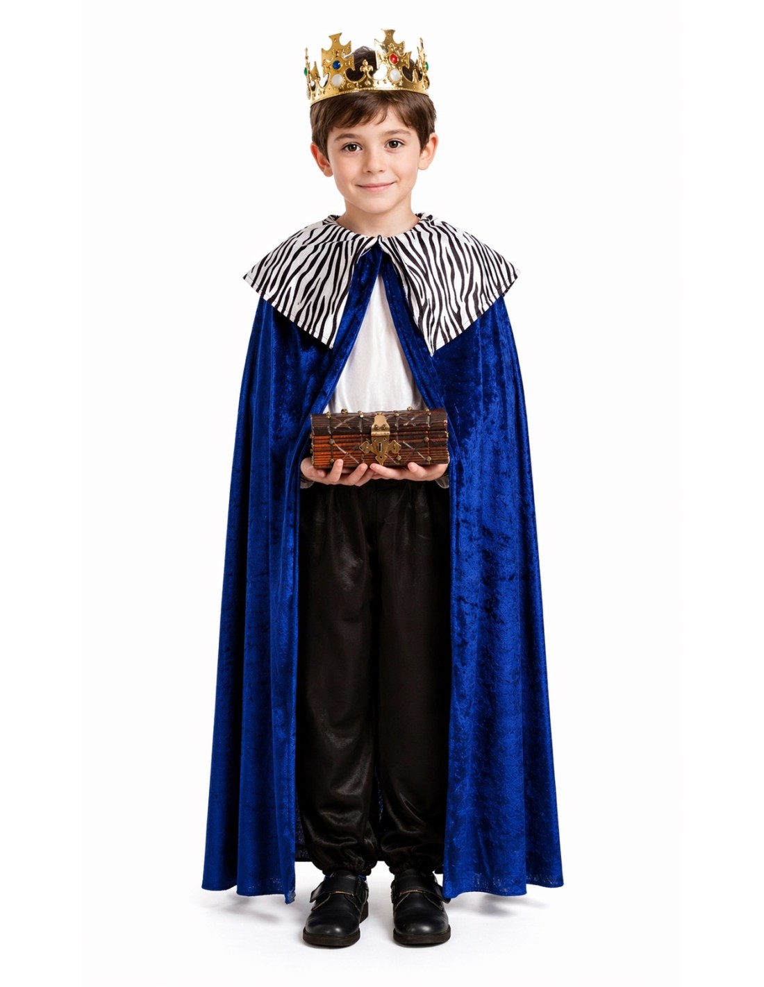 King's cape or royal page, made of high-quality thick velvet, soft to the touch, and with a spectacular drape. Its elegant electric blue color provides a distinguished and majestic finish. The collar, also made of velvet, features an elegant animal print pattern that enhances the ensemble with a royal touch. The side velcro closure at the neck ensures safety and comfort, complying with current regulations. An ideal garment to complete royal outfits with style and distinction.