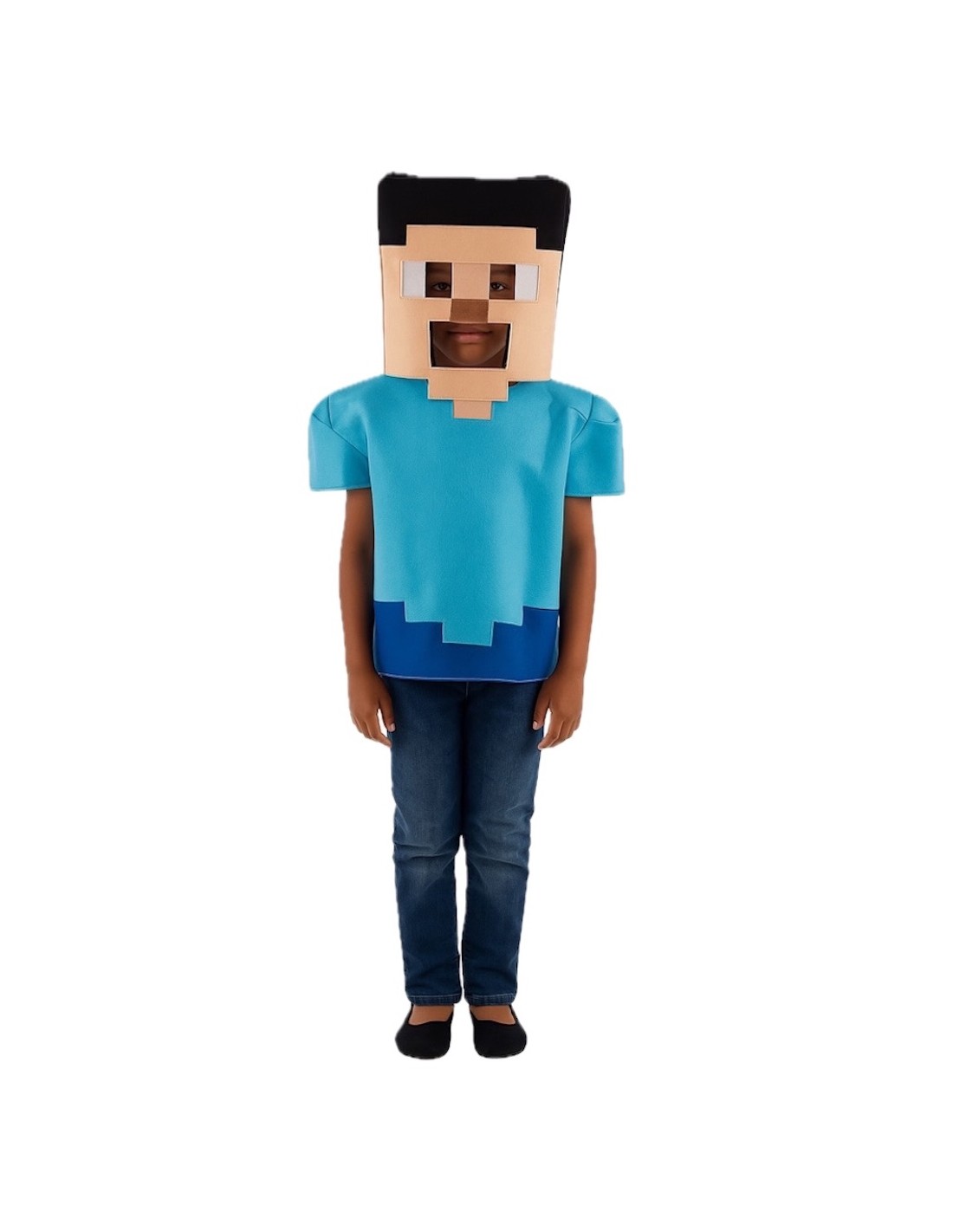 Esteve costume, inspired by the popular video game character. Made of soft foam-padded polyester, it stands out for its defined structure and comfortable design. It includes a straight, wide, and lightweight t-shirt with a velcro closure at the back of the neck for easy wearing. The hood, separate from the t-shirt, features the character's iconic square shape, also padded to maintain its shape during use. A striking set, easy to wear, and perfect for themed parties or costume events.