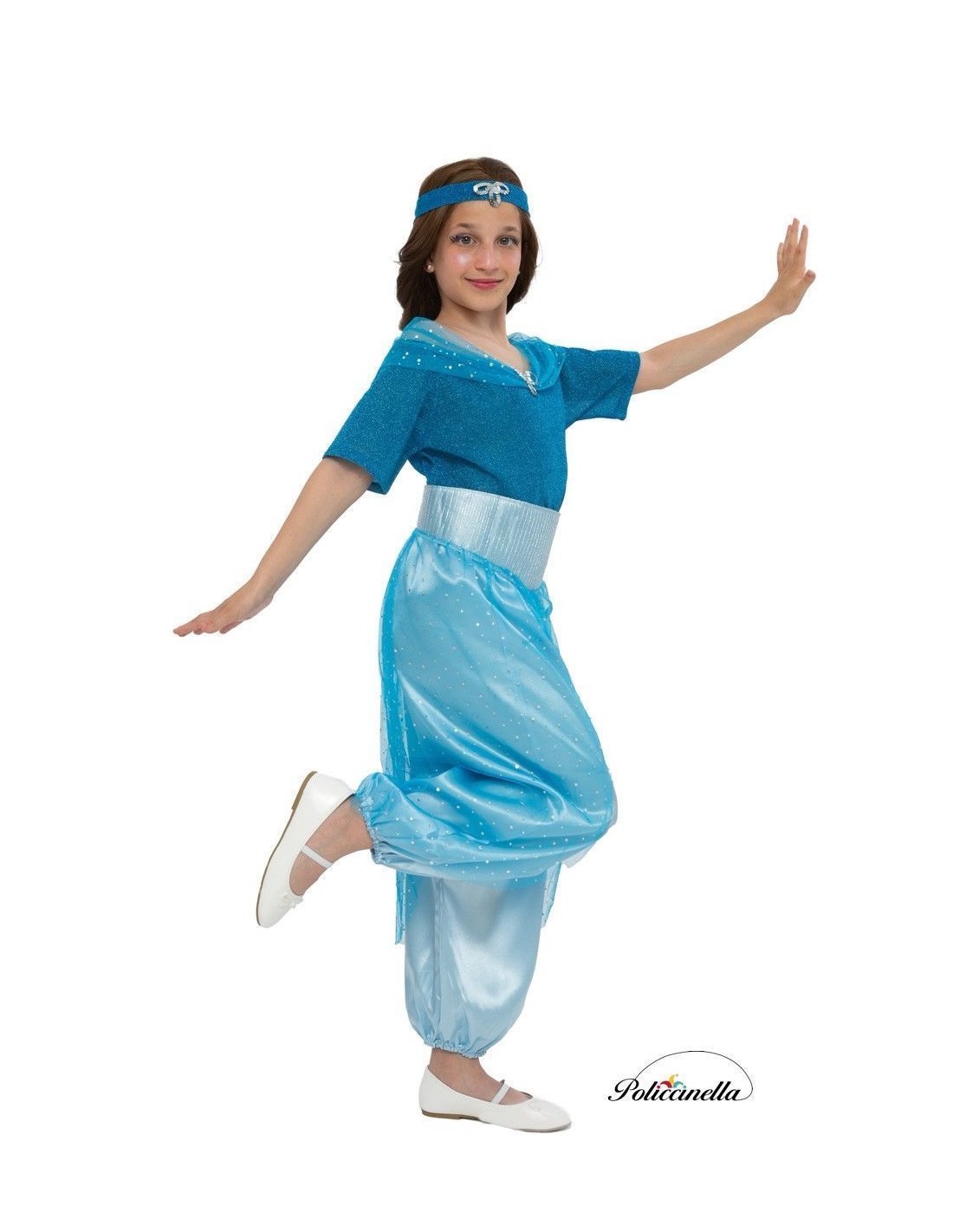 This elegant costume, made of soft satin, consists of a shirt decorated with sequins and tulle with a silver sequin trim on the neckline. The sash, in silver-blue color and adorned with tulle and silver details, falls over the pants and closes with velcro at the back. The pants are made of soft satin and have an elastic waist. The ensemble is completed with a sequined turban that coordinates with the shirt's decoration.