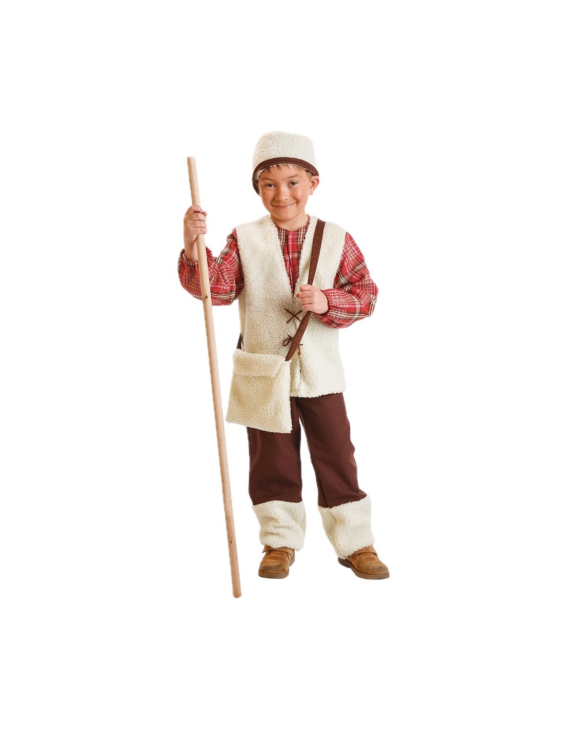 Shepherd costume consisting of a shirt with an integrated vest, made in one piece. The shirt is made of dense polyester (similar to tablecloths), while the simulated vest at the front features a sheepskin-like fabric with decorative zigzag lacing. The back of the vest is made of machine-knit fabric for added comfort. The semi-elastic pants have an elastic waist and ankle finishes decorated with matching sheepskin appliqués. It includes a coordinated cap and satchel, completing the ensemble with aesthetic coherence.