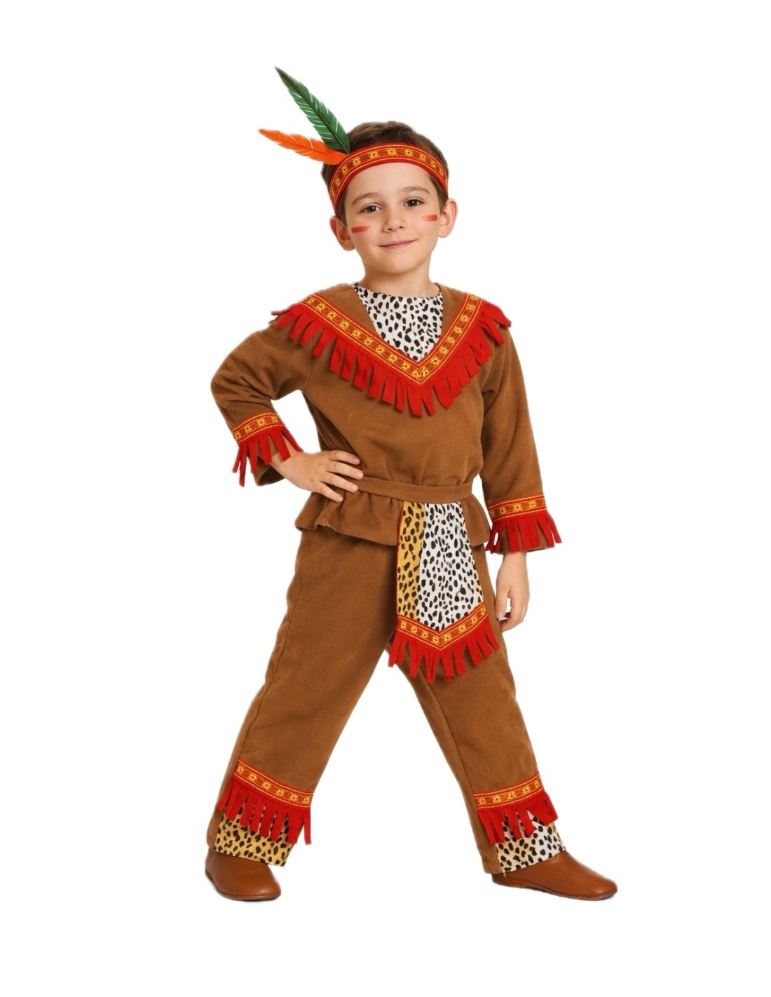 This costume, made of a soft fabric similar to velvet, emulates the characteristic outfit of Native Americans from the West, who used animal hides from their hunts for its creation. The jacket closes with Velcro at the back of the neck. On top of it, a chest piece with an animal print pattern has been made, adorned with fringes and patterned ribbon, the same one used for the headpiece, which is secured with an elastic band. The pants, with an elastic waistband and an internal pocket, feature the same decoration at the ankles as the chest piece. The outfit is completed with an apron that harmonizes with the rest of the costume in terms of tones, fabric, and details, and it is tied at the waist with a bow.