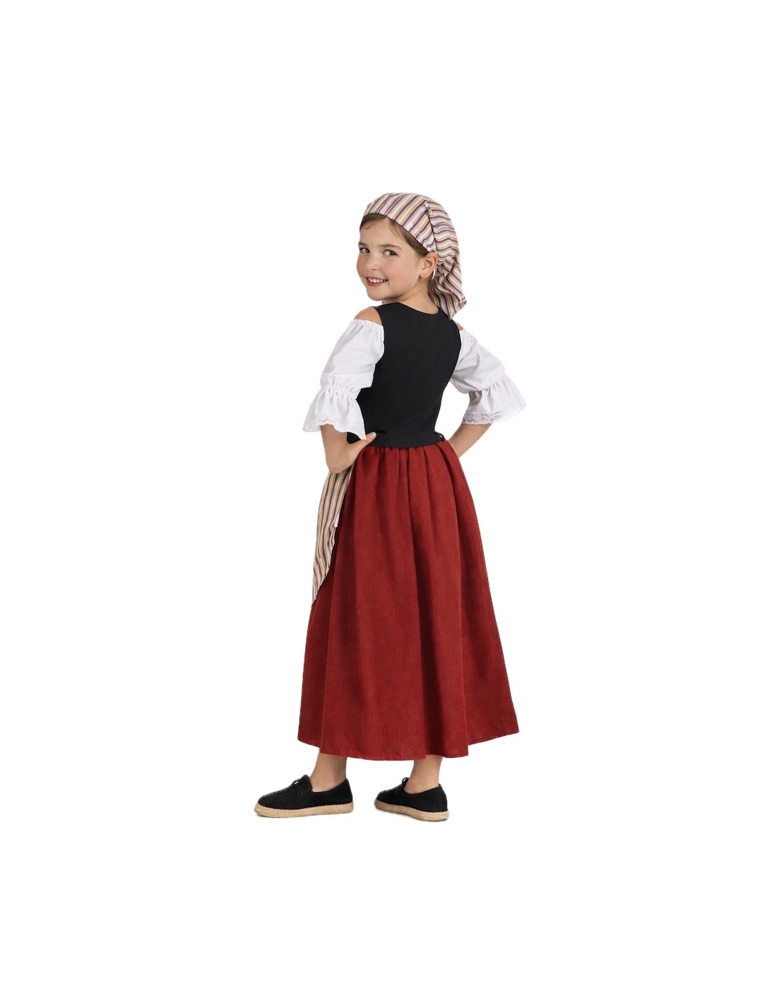 This waitress costume consists of a polyester shirt with elbow-length sleeves, held by an elastic band. The shirt is adorned with lace and has a boat neck with an elastic band to hold it on the shoulders. The vest, also made of polyester, has a laced closure on the chest. The skirt, in an A-line cut and made of a peach-like fabric, reaches the floor and has an elastic band at the waist. The costume is completed with an apron made of a vintage-style printed fabric and a hair scarf woven with the same fabric as the apron.