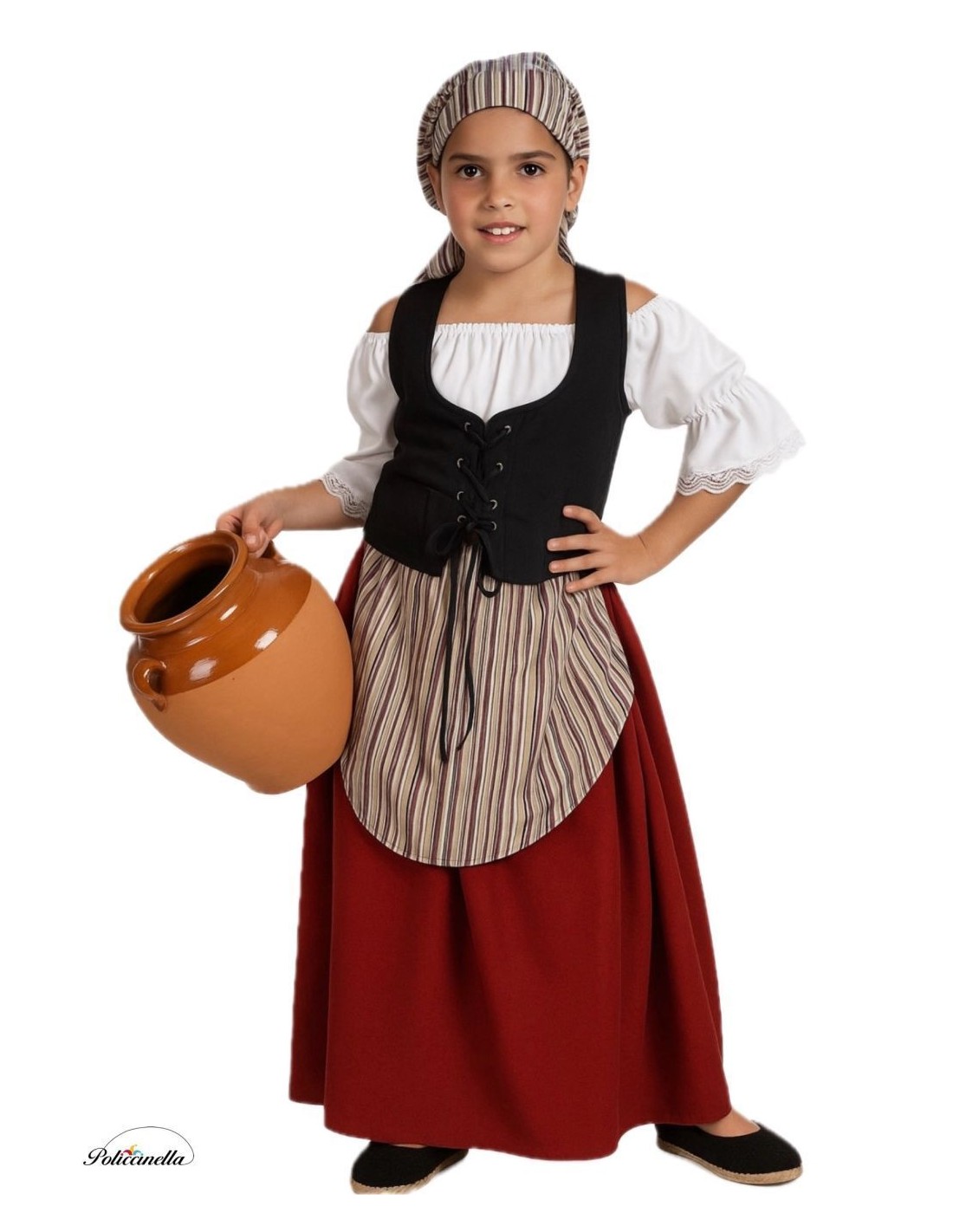 This waitress costume is composed of a polyester shirt with elbow-length sleeves, secured by an elastic band. The shirt is adorned with lace and a boat neckline with an elastic band to secure it to the shoulders. The vest, also made of polyester, features a lace-up closure on the chest. The skirt, in an A-line cut and made of a peach-like fabric, reaches the floor and has an elastic band at the waist. The costume is completed with an apron made of an old-fashioned patterned fabric and a headscarf woven in the same fabric as the apron.