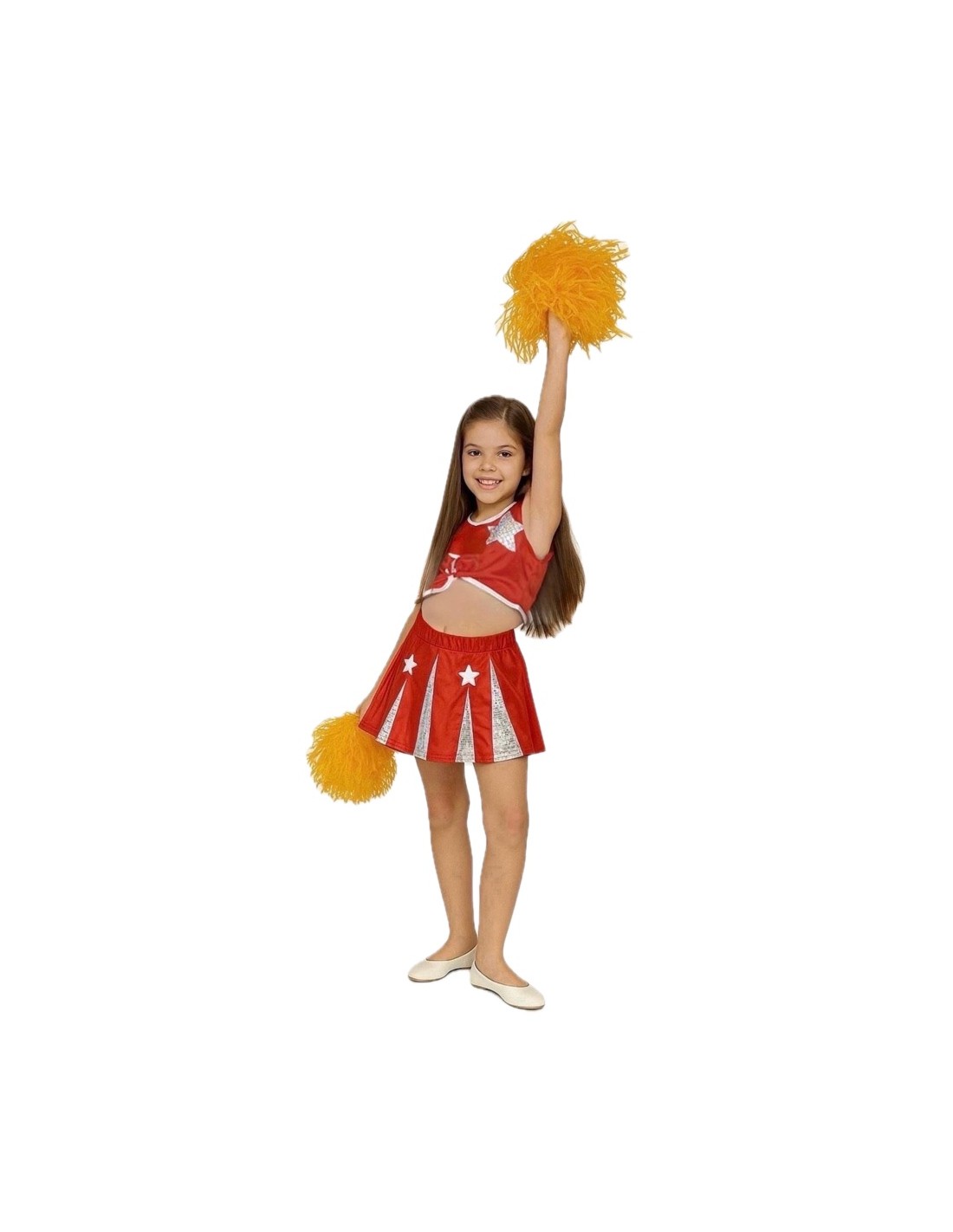 Children's cheerleader costume, cheerful and full of energy. Made of soft, semi-elastic machine-knit fabric, it includes a crop top with a front zipper and two points to tie, finished with silver ribbon. Decorated with felt stars on one side and a silver star with colorful rhinestones on the other. The gathered miniskirt with elastic at the waist adds volume and movement. It is decorated in the front and back with the same stars, and the ties are made of the same shiny fabric as the star for a harmonious and attractive finish.
