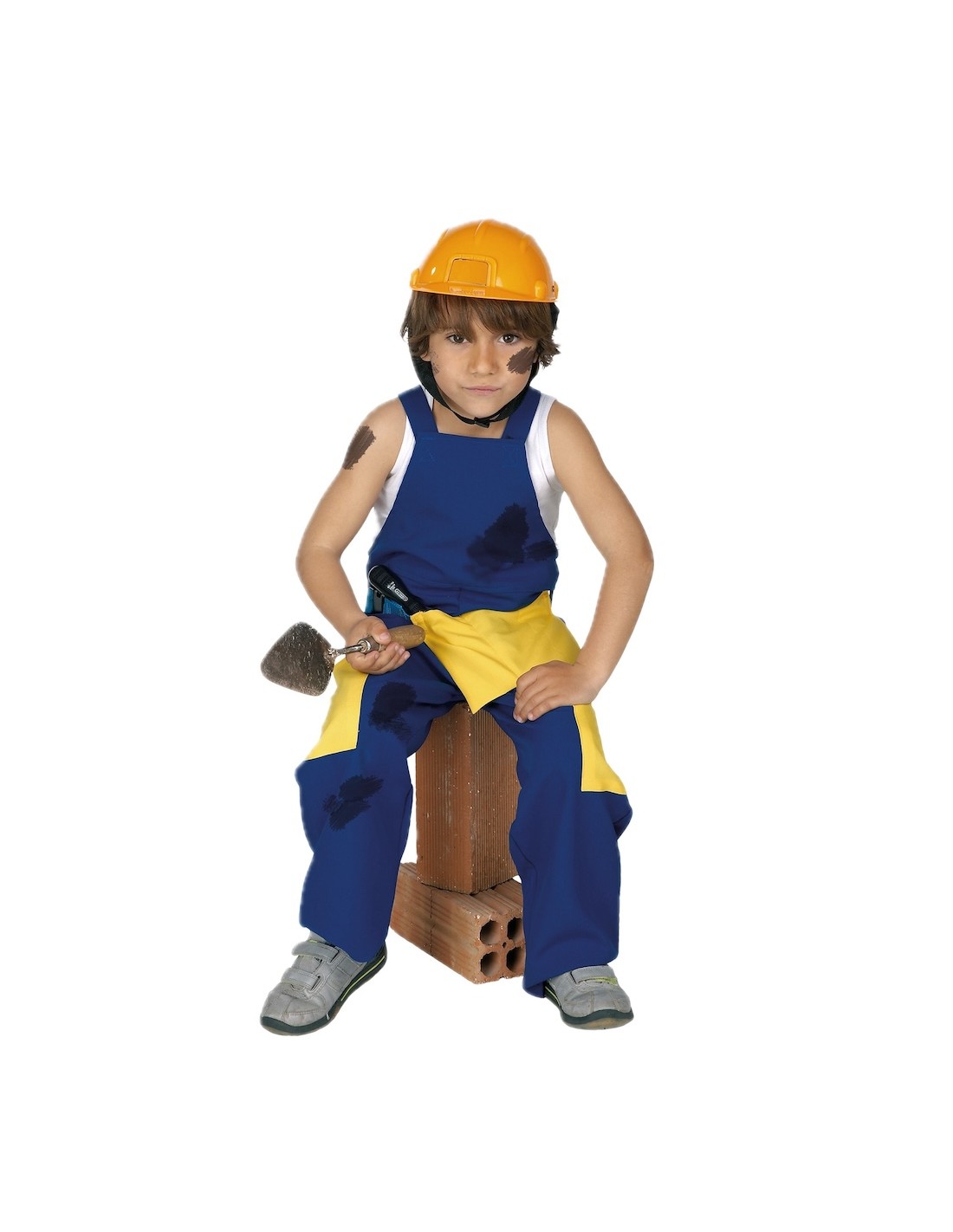 Child mason costume, comfortable and functional, ideal for role-playing games and school activities. It consists of overalls made of thick and soft polyester, with suspenders that fasten with Velcro at the front. It includes two large yellow side pockets and loops at the waist to attach the nylon belt with a plastic safety buckle. The belt has a practical pocket with three compartments. A lightweight, durable, and high-quality set that encourages realistic and stylish play.
