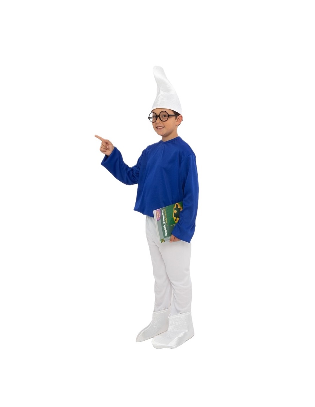 This costume consists of the following pieces: SHIRT with a closure at the back of the neck using a velcro system and elastic at the bottom for a better fit and a puffy effect; PANTS with an elastic waistband and an internal pocket; both pieces made of semi-elastic machine-knit fabric; HAT with a curved shape made of foamed polyester to preserve its structure and shape; and SHOE COVERS made of the same material.