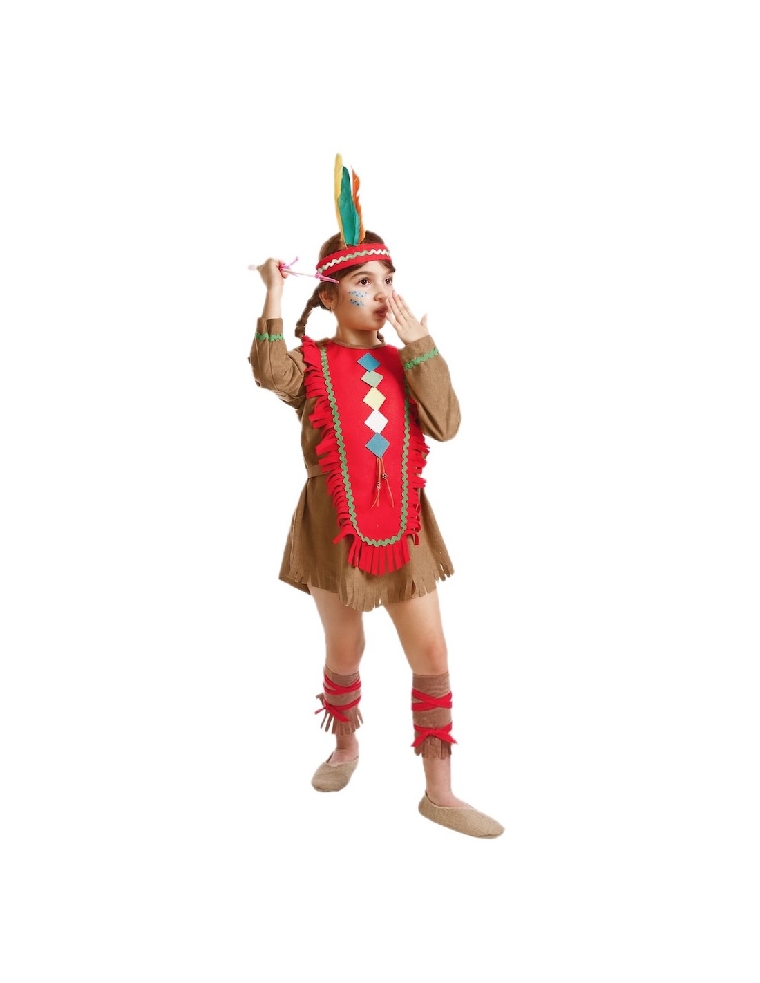 This beautiful Native American costume, made of soft peach-feel polyester, consists of a dress with a vivid red chest that extends almost to the bottom. The dress is decorated with the typical fringes and colors characteristic of the character. The sleeve is short and decorated, like the dress, with a strip of red and green wavy trim. The costume has a closure at the back of the neck with Velcro. It is completed with leg warmers with red laces made of the same fabric as the rest of the outfit, and a headband with three brightly colored feathers, with elastic at the back to adjust to the head.