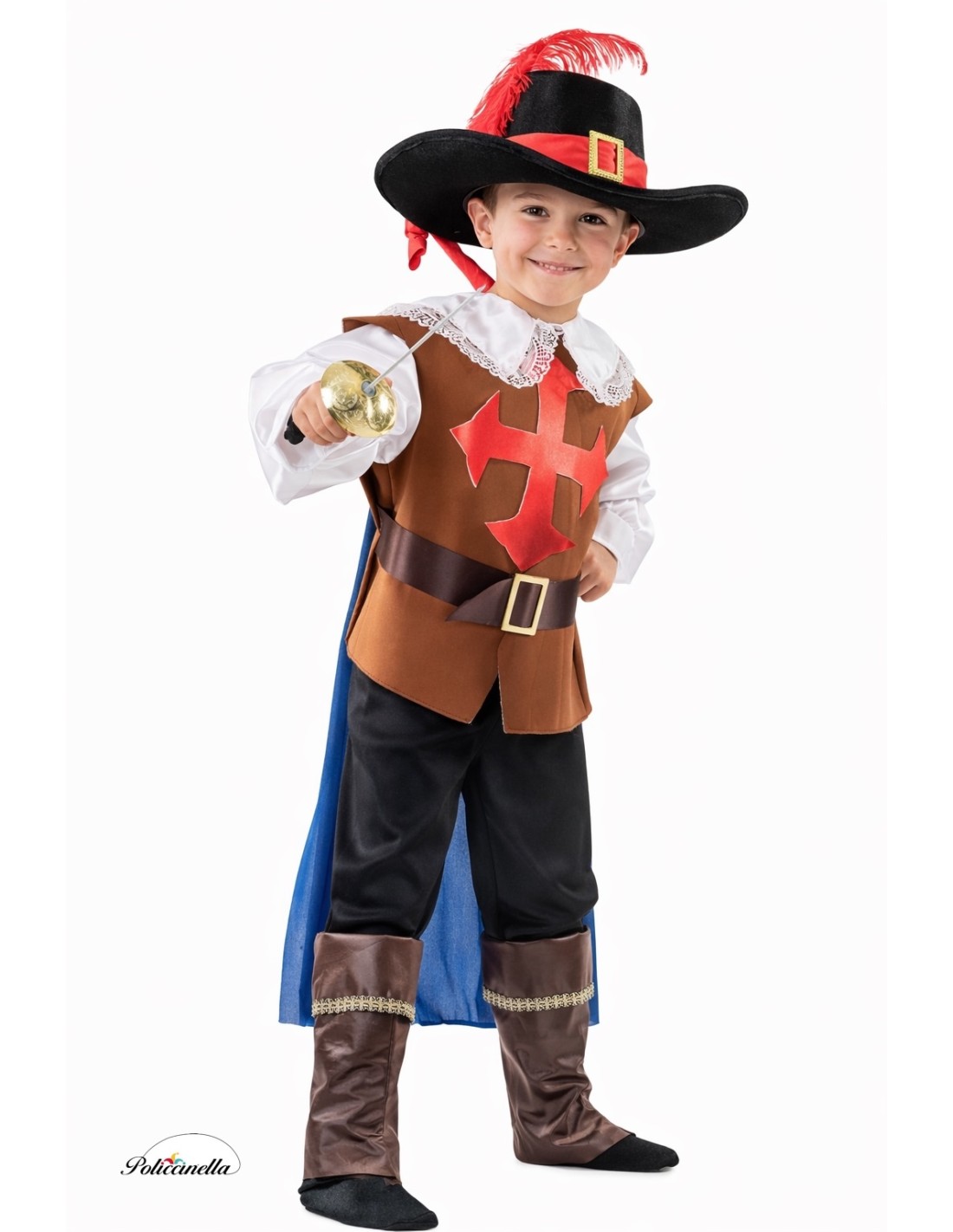 This musketeer costume includes an integrated vest that combines the appearance of a white shirt underneath, made of satin with a typical collar from the era, adorned with lace and elastic sleeves at the bottom for added volume, creating the effect of two garments in one piece. The vest, in foanized machine knit, features a printed design on the front and exterior shoulder pads. It incorporates a satin cape, attached to the vest with velcro. The black pants, in machine knit, have elastic waistbands for a better fit. A dark brown polyester belt woven over felt, with a leather-like appearance and a functional rectangular gold buckle, is added, along with the boot shafts, made of the same fabric with gold trim for a distinctive touch.