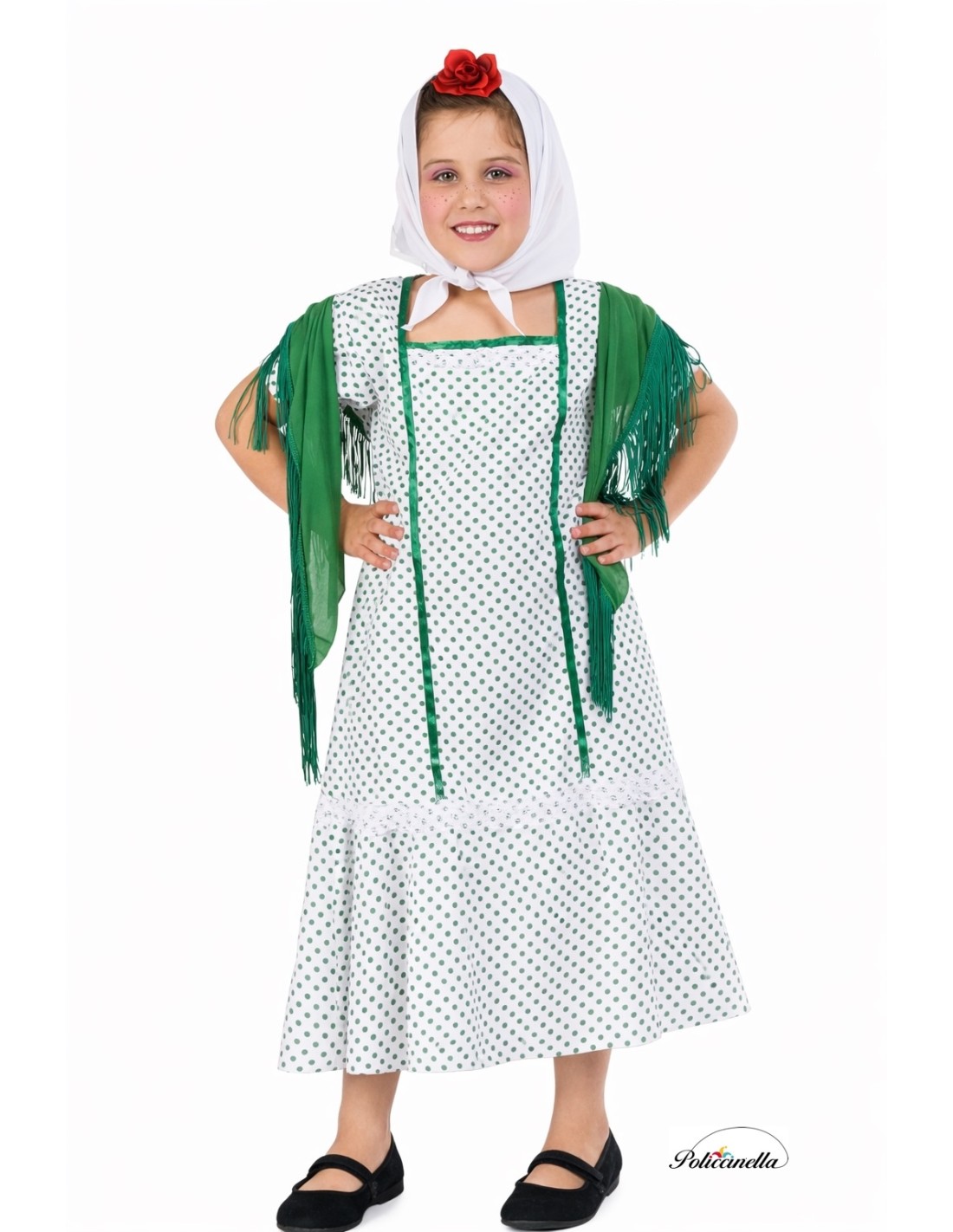 Traditional and authentic chulapa dress, made of soft satin with a square neckline and Velcro closure at the nape of the neck. Elastic bands on the back and sides enhance the figure comfortably. Decorated with ribbons and satin bows matching the polka dots and delicate lace. The sleeves have elastic for a perfect fit. Includes a headscarf and the classic shawl in soft machine-knit with fringes, to complete this charming Madrid ensemble.
