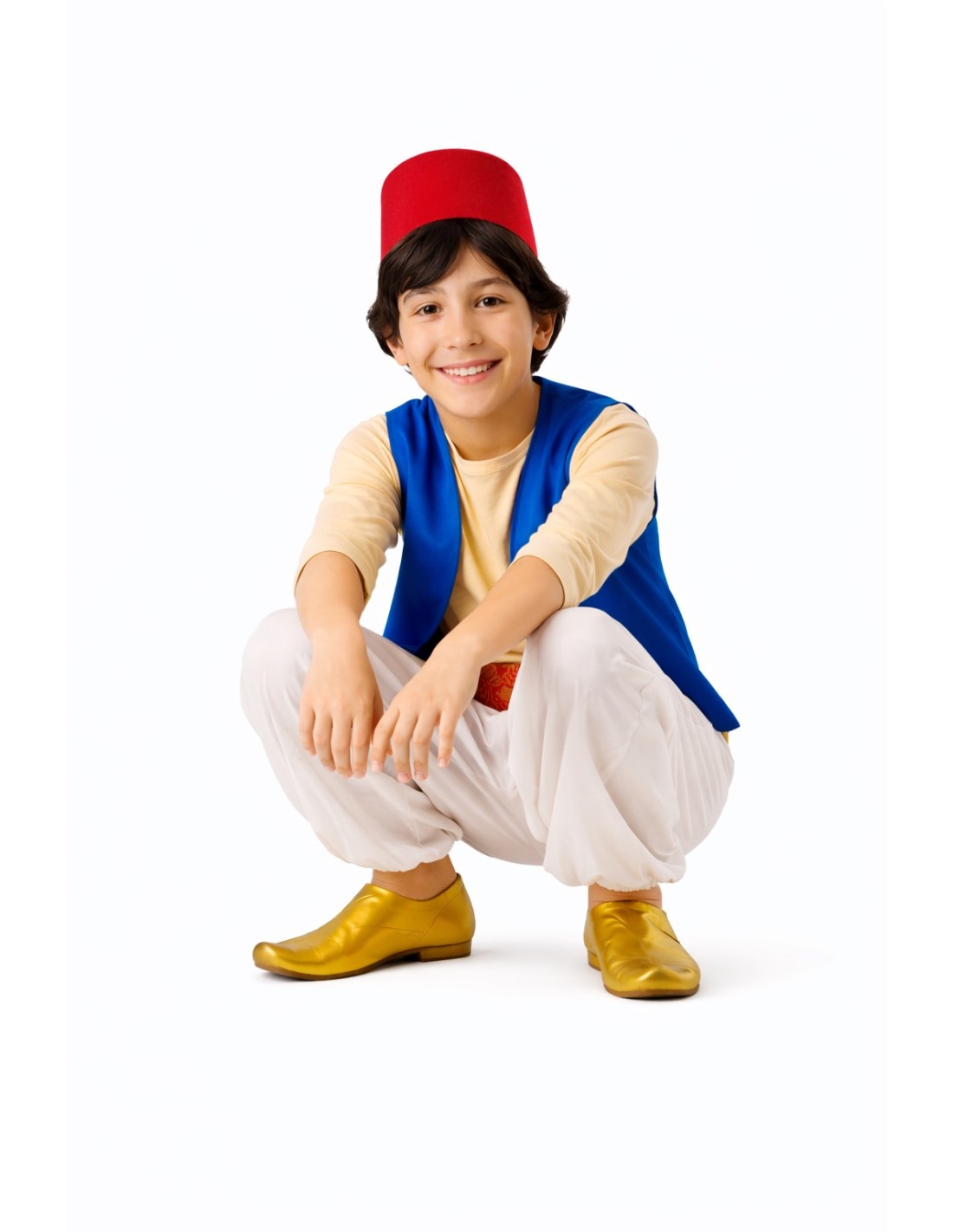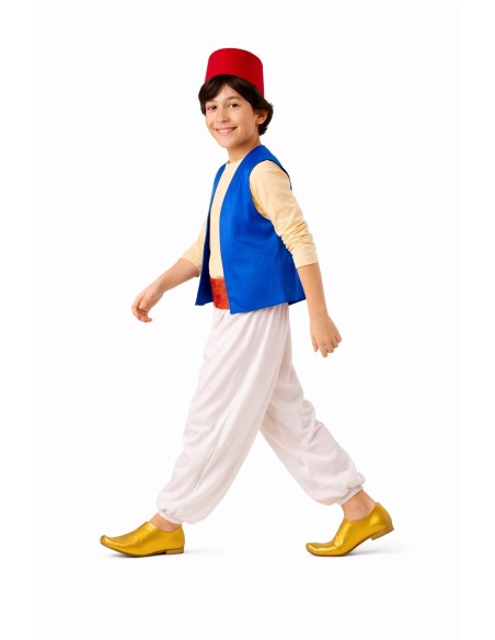 Beautiful costume consisting of a soft, semi-elastic machine-knit shirt with Velcro closure at the nape, a vest, and satin pants with elastic at the waist and ankles, as well as small interior pockets. It includes a sash made of brocade fabric with Velcro adjustment at the back and the classic hat (fez or tarbush) made of foam-lined satin to maintain its shape without deforming. Lightweight, comfortable, and with careful finishes for an authentic look.