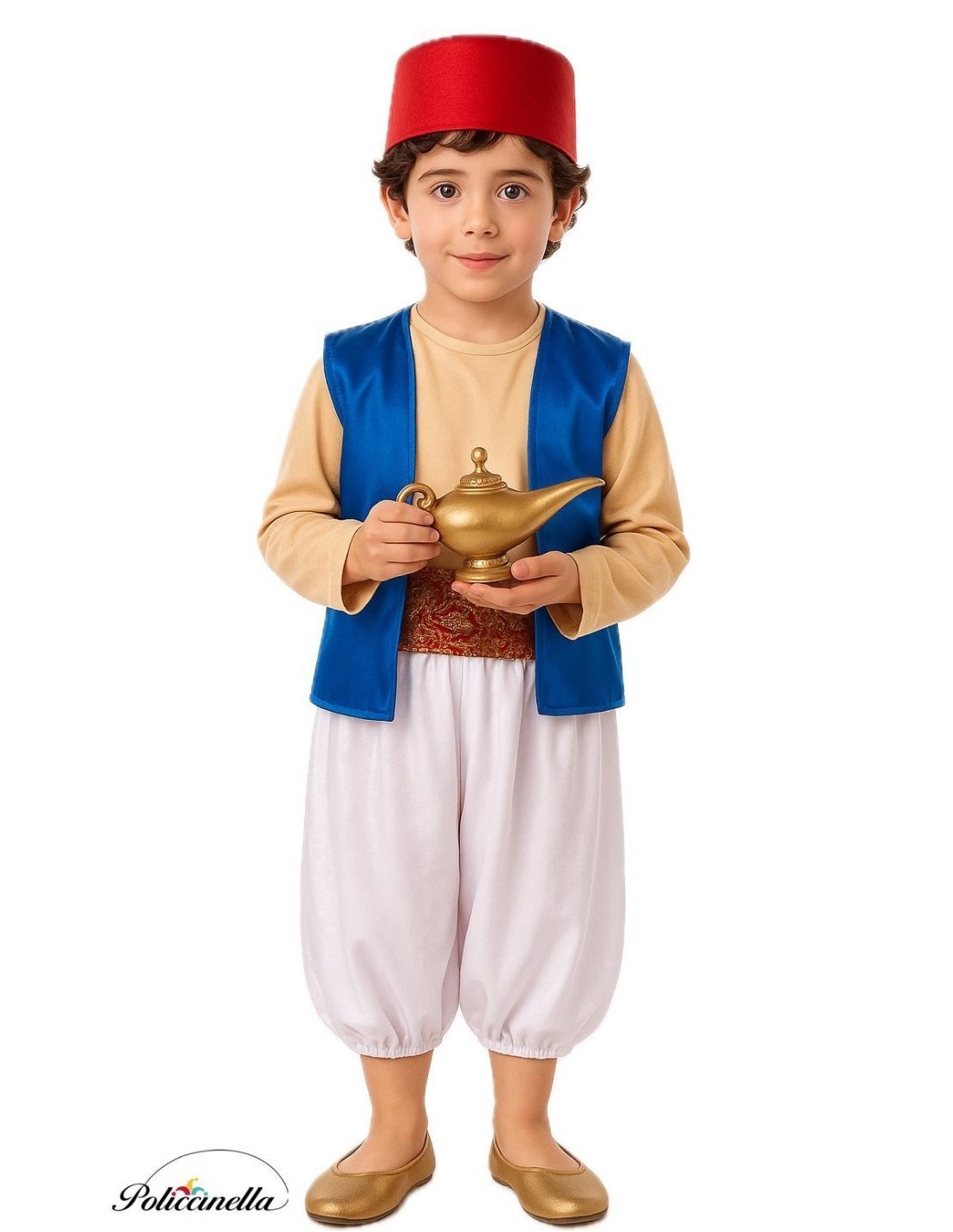 Beautiful costume consisting of a soft, semi-elastic machine-knit shirt with velcro closure at the nape, a vest, and satin pants with elastic waistband and ankles, as well as small interior pockets. It includes a brocade sash with velcro adjustment on the back and the classic hat (fez or tarbush) made of foamed satin to maintain its shape without deforming. Lightweight, comfortable, and with careful finishes for an authentic look.