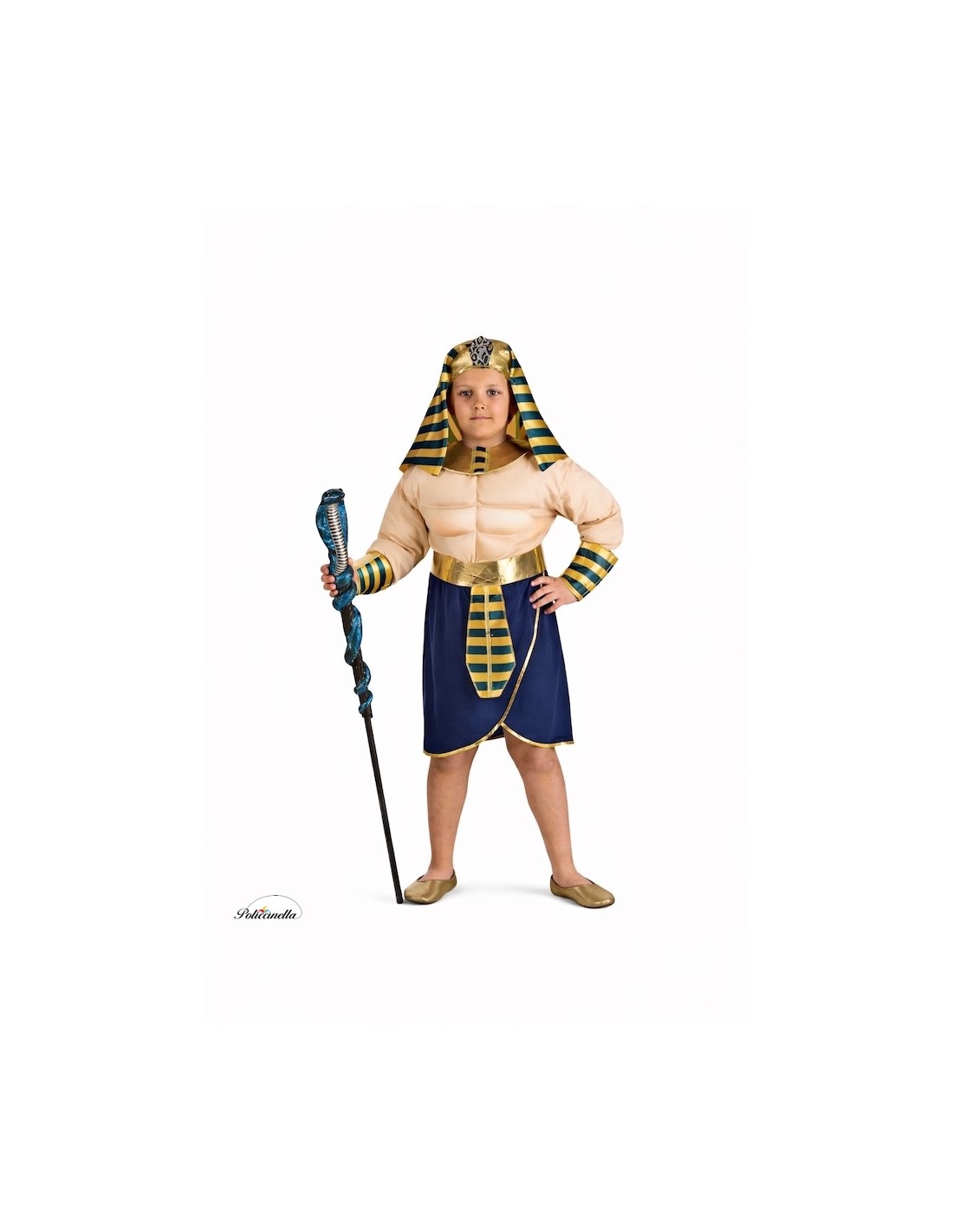 This pharaoh costume recreates the greatness of ancient Egypt with high quality craftsmanship and faithful details. The shirt, made of semi-elastic machine-knit fabric, features foam padding on the front and shoulders to simulate musculature, with a velcro closure at the back of the neck. The skirt, made of the same fabric, has an elastic waistband and is decorated with golden ribbons on the front. The accessories, made of foamy golden satin, provide firmness and enhancement, with velcro closures for added comfort. The highlight of the costume is its headdress or nemes, the quintessential symbol of pharaohs, made of striped satin. Its front part is reinforced and padded to stay upright, while the fabric covers the crown, falls over the nape, and extends towards the shoulders, just like the authentic ones did. A rear elastic ensures a perfect fit. A comfortable, durable, and majestic ensemble, ideal for embodying the strength and splendor of ancient Egypt at parties and performances.
