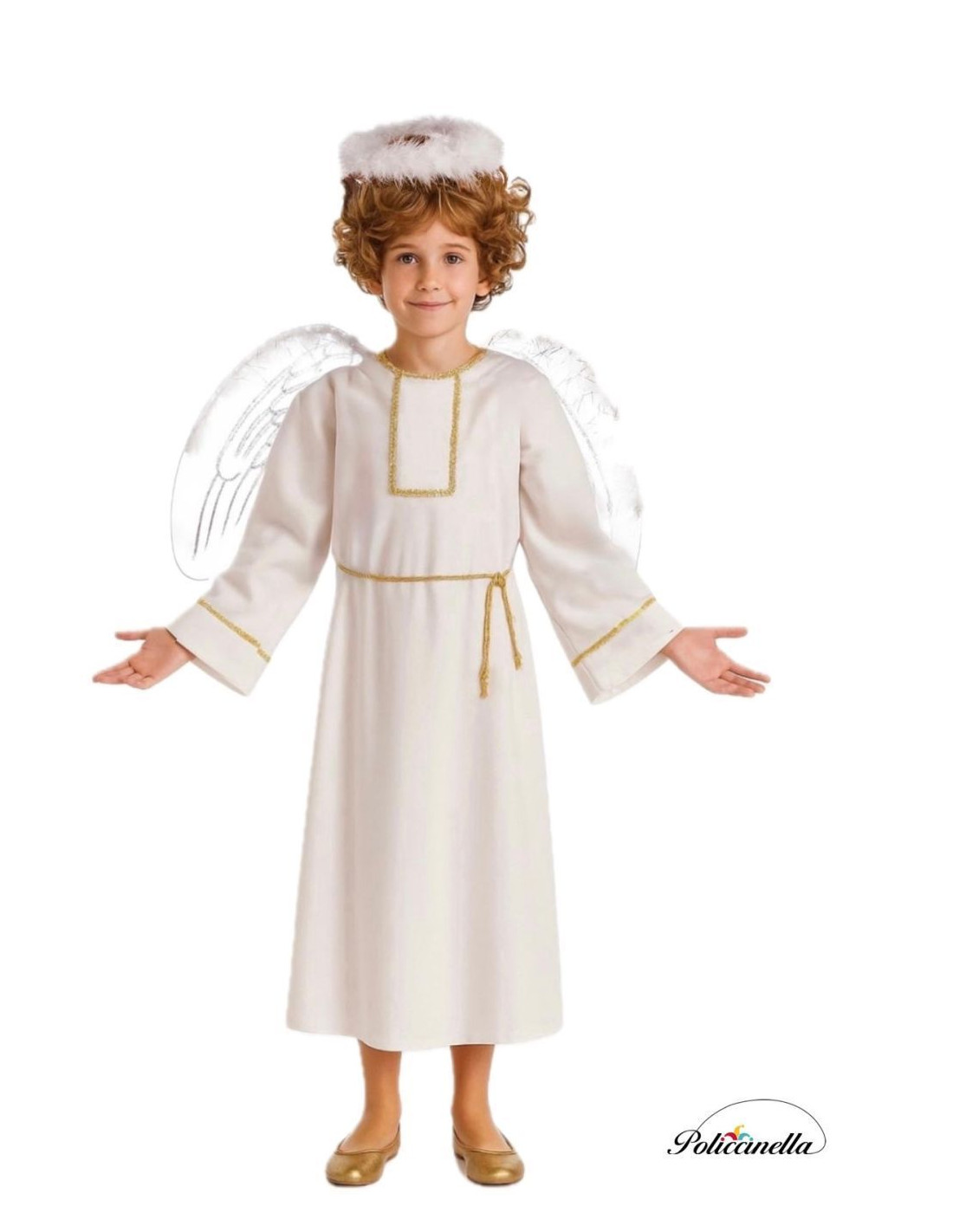 This angel costume stands out for its delicacy, comfort, and high quality in every detail. The long tunic, made of peach-like polyester, features a straight cut with elastic at the back of the waist for a perfect fit and a velcro closure at the neck. It is decorated with elegant golden trim on the chest and sleeves, along with a piece of tulle with golden sparkles that give it a celestial look. It is completed with a headband adorned with soft white boa feathers and, most importantly, with the costume's jewel: spectacular lightweight wings, made of knit fabric on wire structure, decorated with boa feathers and easy to put on thanks to their backpack-style elastic straps. A durable, eye-catching, and charming ensemble, ideal for living nativity scenes, school festivals, or magical Christmas celebrations.