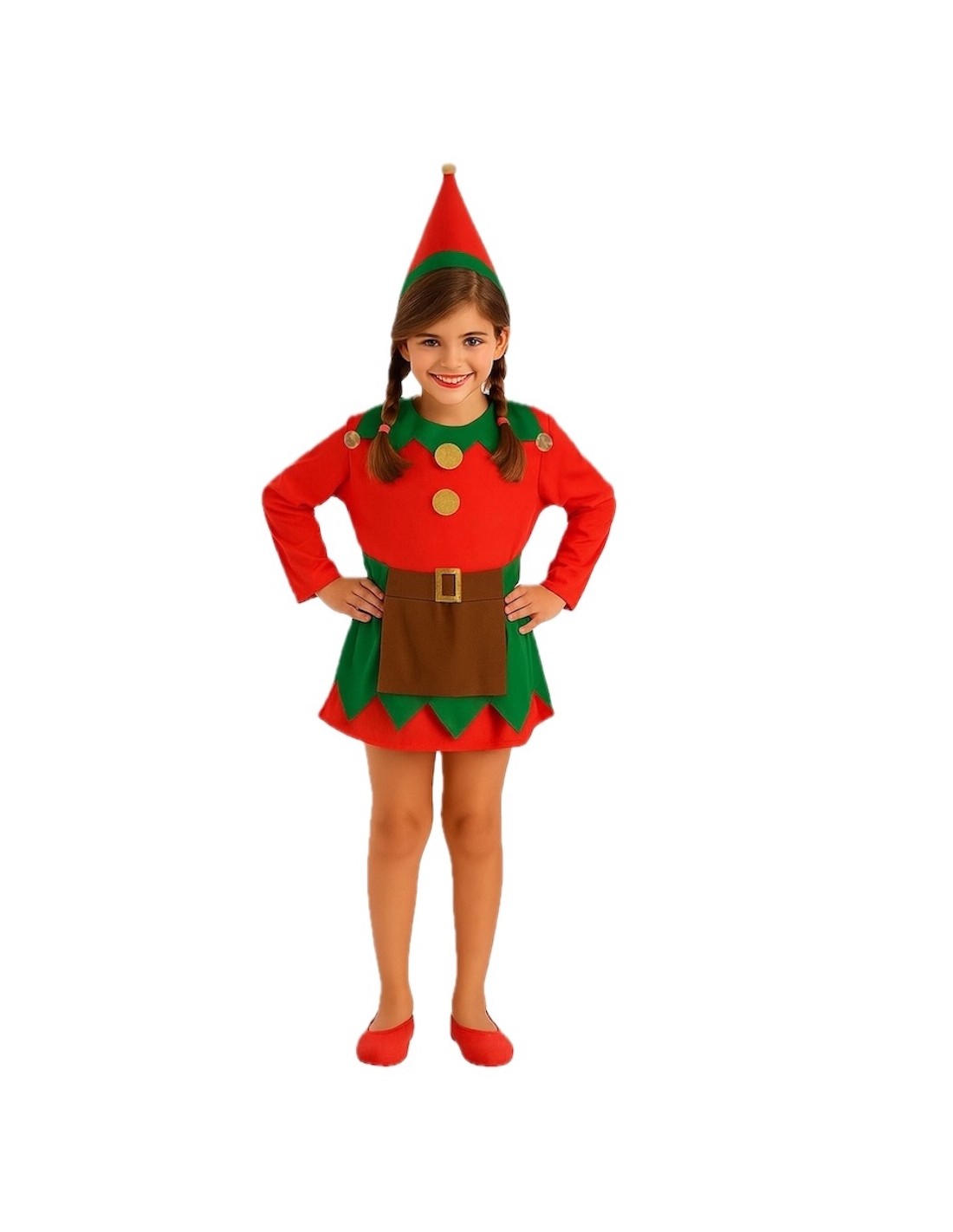 Charming dress made of semi-elastic machine-knit fabric, soft to the touch and with gathered waist for a flattering fit. The collar and skirt have a peach-like texture, decorated with golden button appliques that provide a shiny and festive touch. The brown apron, sewn to the skirt, adds a traditional nod to the design. It includes a felt belt with a gold foam buckle and velcro closure, and a conical-shaped hat with peach-colored trim and a golden ornament on the tip. A high-quality set for an unforgettable elf.