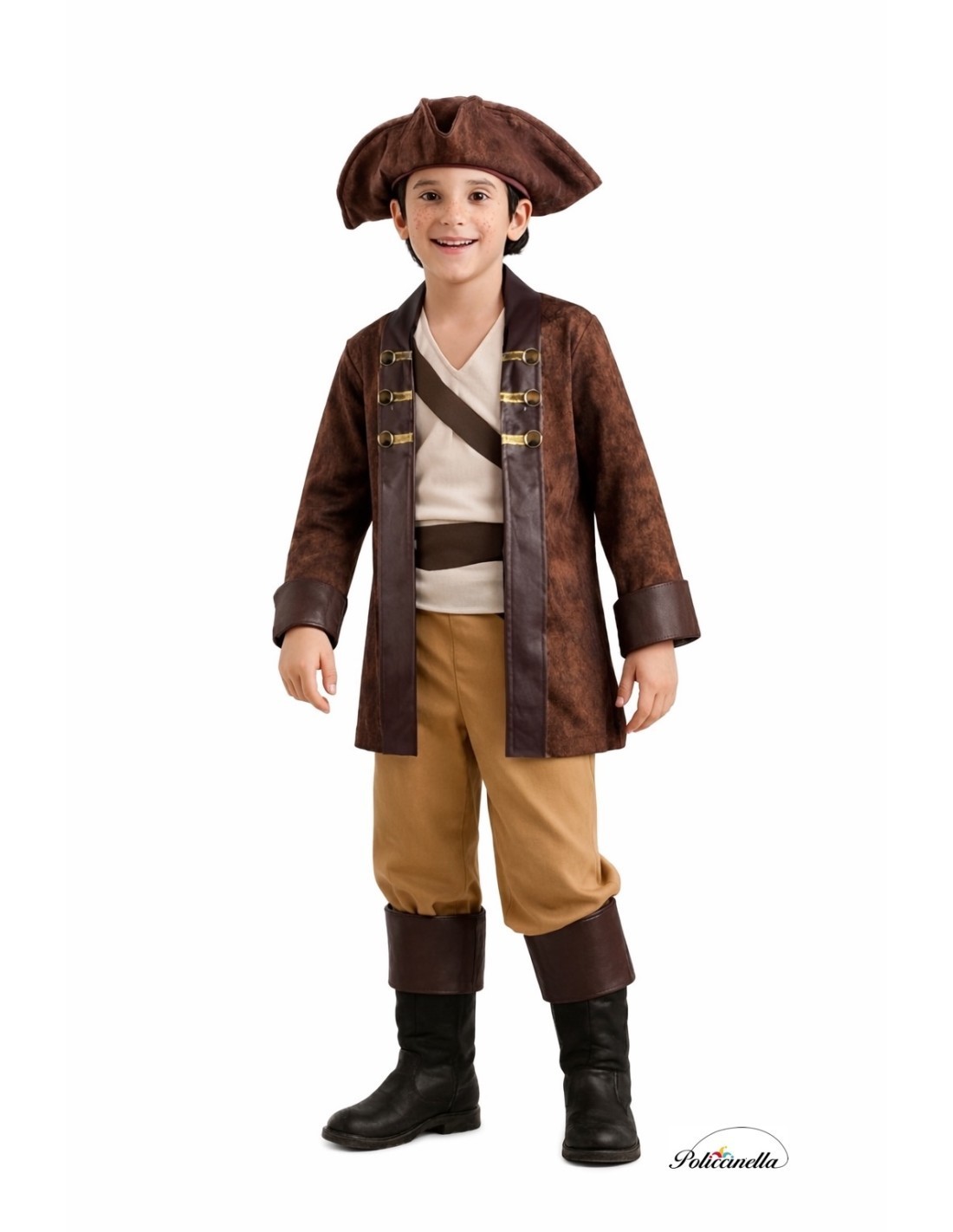 This costume stands out for its attention to detail and quality in each garment. The long frock coat, made of peach-touch fabric with leather effect, features structured lapels and cuffs on a TNT base, adorned with sewn gold pieces and gold plastic buttons with a metallic finish. It has an elastic back for a comfortable fit. The faux shirt made of soft machine-knit fabric includes a ruffle at the neck, velcro closure at the back, and a tie closure. It is accompanied by structured TNT ribbons that fasten with velcro, simulating a belt and front decoration. The peach-touch pants with an elastic waist and internal pocket have rigid cuffs to cover the calf of leather-effect boots.