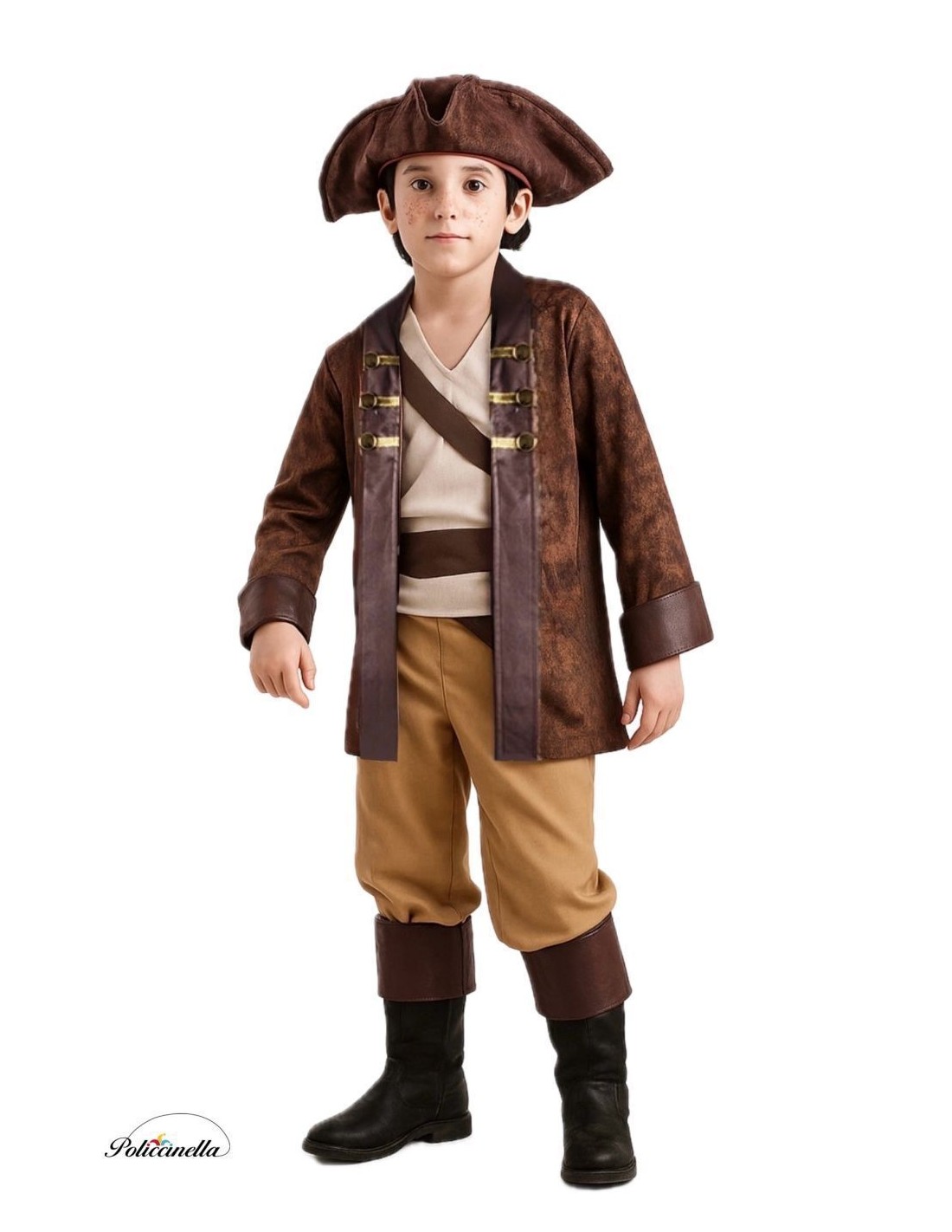 This costume stands out for its attention to detail and quality in each garment. The long frock coat, made of peach touch fabric with leather effect, features structured lapels and cuffs on a TNT base, adorned with sewn golden pieces and a golden plastic button fastening with metallic finish. It has a back elastic band for a comfortable fit. The false shirt made of soft machine-knit includes a ruffle collar, velcro closure on the back, and adjustable with a tie. It comes with structured TNT ribbons that adjust with velcro, simulating a belt and front ornament. The peach touch pants, with elastic waistband and internal pocket, have rigid hems to cover the boot shafts made of leather effect.