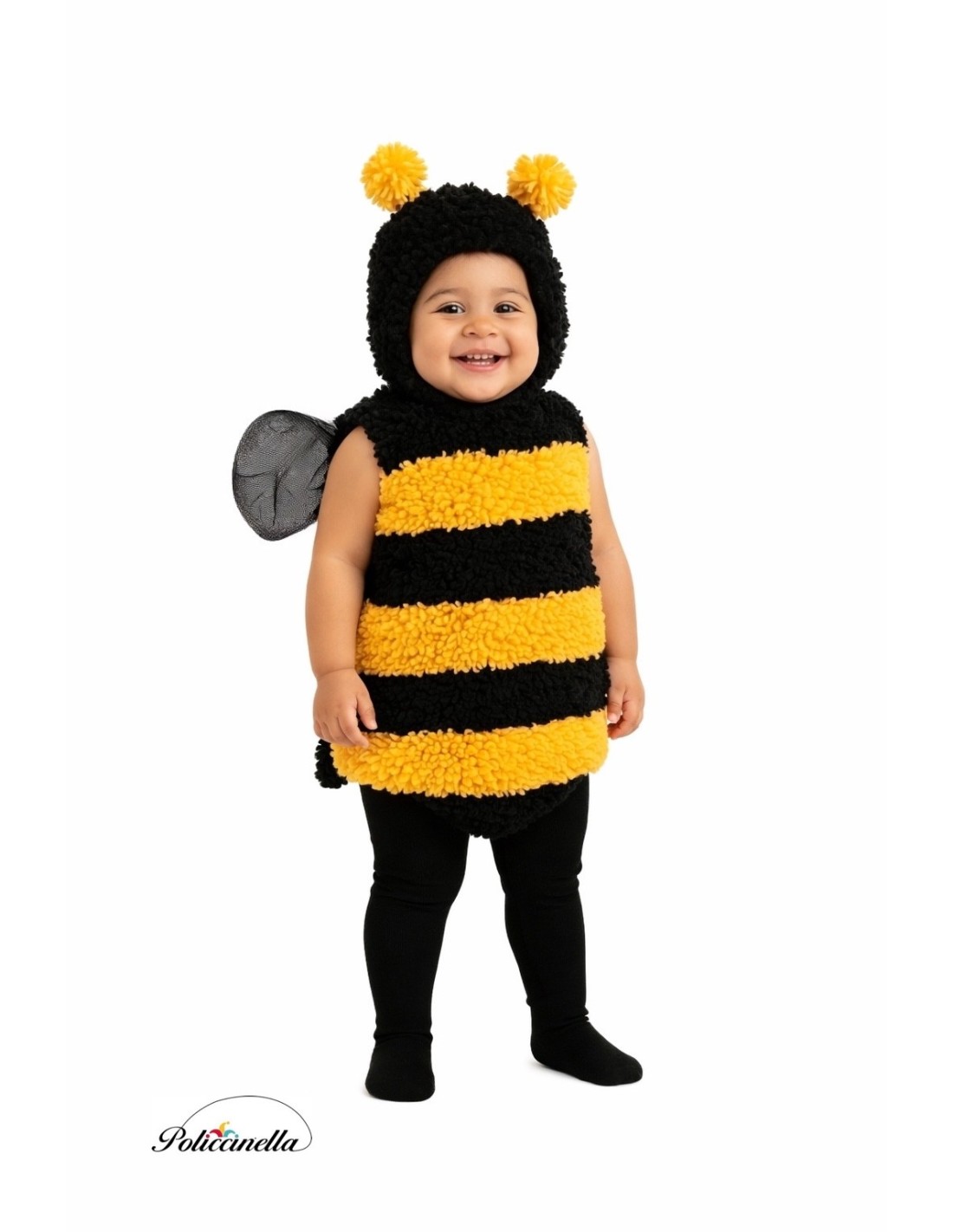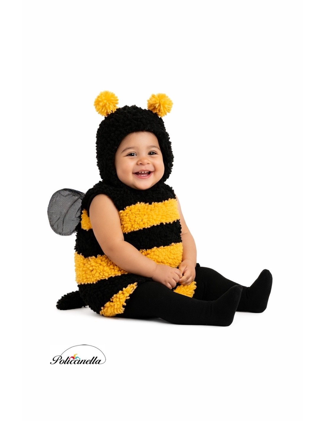 Sweetness and comfort come together in this charming little bee costume, made of soft terry fabric and with an inner lining for added comfort. It features a velcro closure from the neck to the waist at the back for easy dressing, and a velcro closure for the hat at the neck for a perfect fit. The diaper cover stands out for its comfort, as it has a practical opening with clips that makes diaper changes or visits to the toilet easier. It includes a tail in the same fabric and wings sewn on the back made of soft tulle, as well as a hat with matching antennas. Ideal for enjoying total freedom and tenderness.