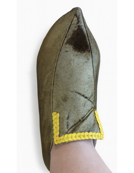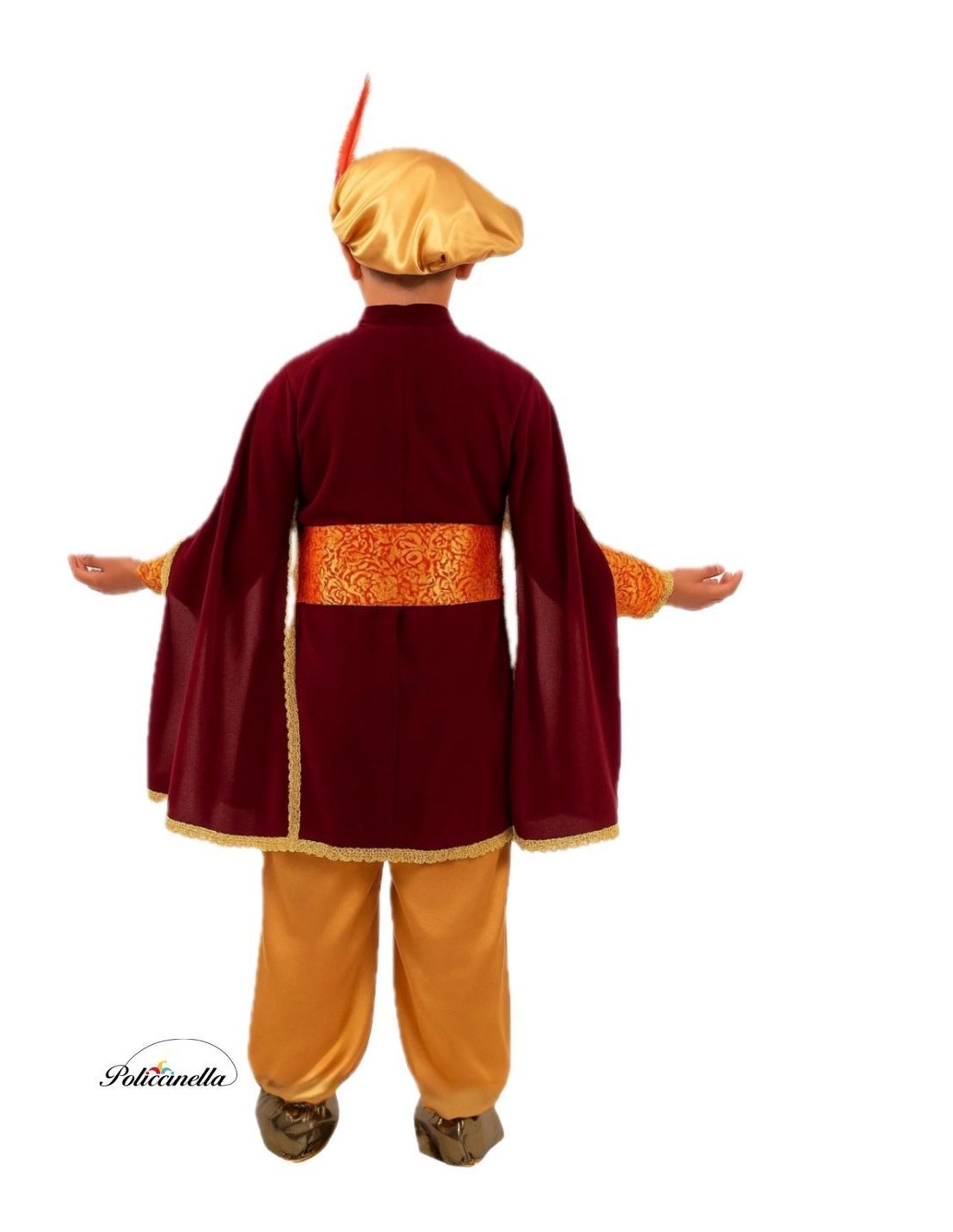 Coat made of peachskin-like fabric combined with printed satin on the chest and sleeves, with gold trimmings. The sleeve, in a cape-like shape, provides more coverage and a more princely look. Just like the slippers, which are adorned with sequins, and the hat with an incorporated red feather. It comes with a sash that fastens and adjusts with a Velcro closure, and golden pants with an elastic waistband and a small internal pocket.
