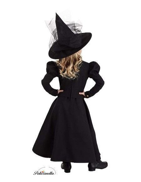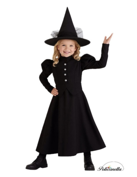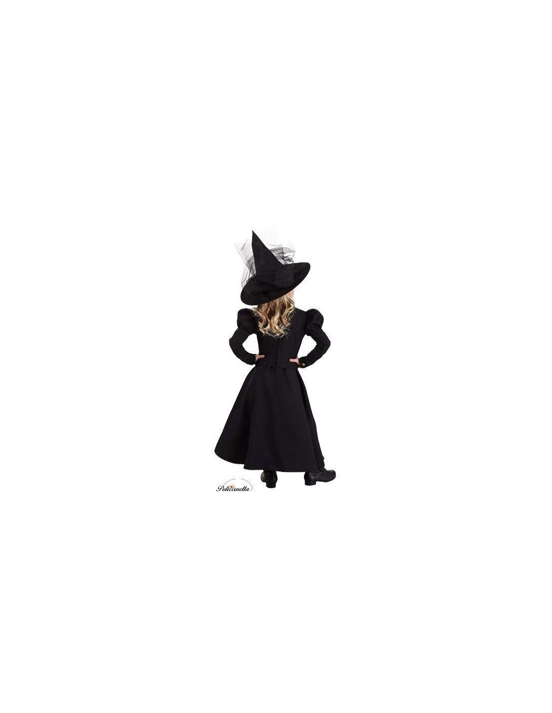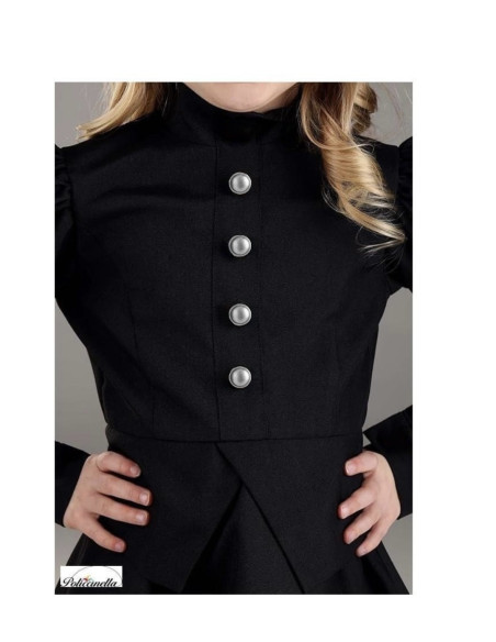 A set that combines mystery and distinction. The dress, made in soft and tucked polyester, looks a long-waist-long design that adapts comfortably. Its lantern sleeves and front decorative buttons bring a classic touch, while the high neck and velcro closure on the back ensure an impeccable finish. The set is completed with a resistant satin hat, with an internal ring that maintains its black shape and tulle that falls to the waist. Its tip lightly curved adds a funny and unique air, ideal for themed or Halloween parties