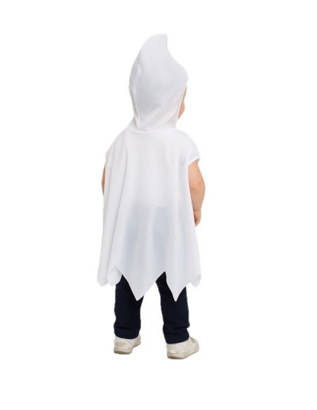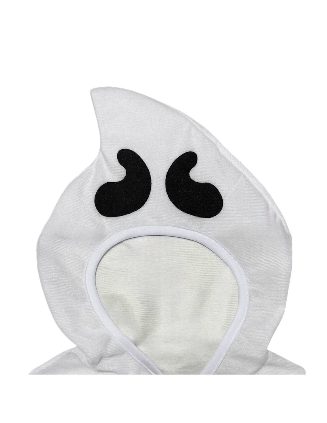 This cape, made of a soft peachskin fabric, features a semi-rigid hood at the top to prevent it from deforming and slipping down, adorned with two black felt eyes. It has a small opening at the neck area to make it easier to put on and two armholes.