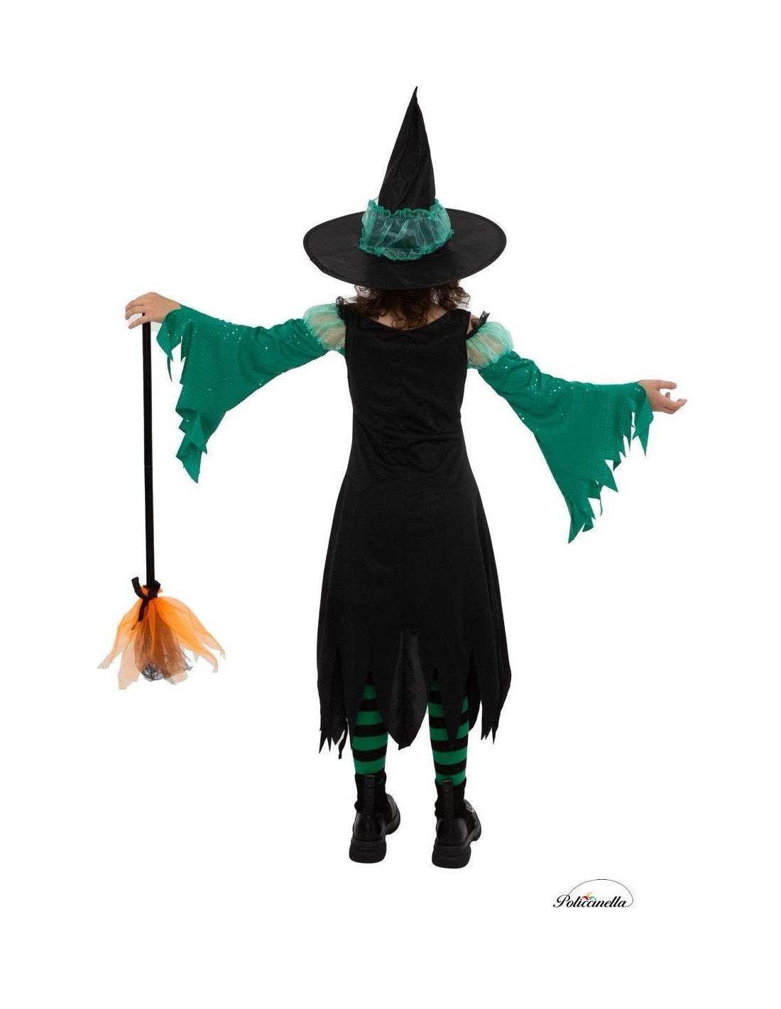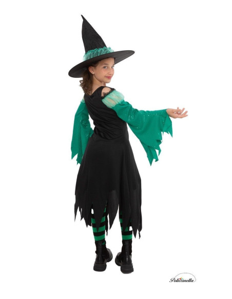 Charming witch costume that combines elegance and comfort. It includes a semi-elastic machine-knit dress with embedded sequins, a low-waisted puffy skirt and a Bardot neckline that enhances the shoulders, with elastic back for a perfect fit. The vest, with an A-line cut and soft fabric, lightly adapts to the figure and fastens with a metallic clasp (random color). The tights, elastic and opaque, provide comfort and style. The ensemble is completed with a hat adorned with matching tulle, lightweight and comfortable. The manufacturer warns that the dress has a tight fit.