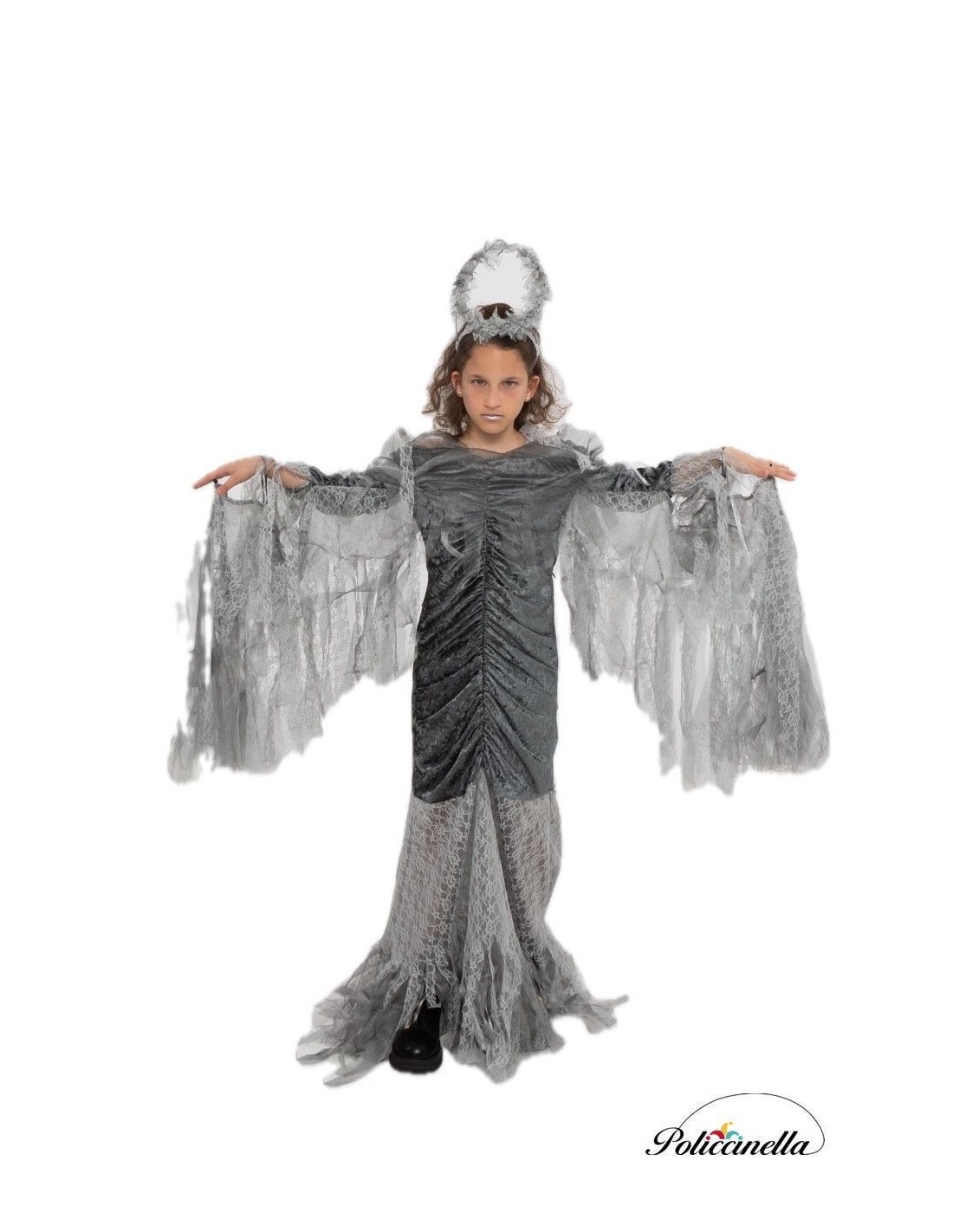 Wrapped in a touch of mystery and fantasy, this beautiful Fallen Angel costume will make any girl feel magical. The dress, made of soft draped and semi-elastic velvet, comfortably adapts to different silhouettes, offering freedom of movement and a charming fit. The long wings, sewn along the sleeves, open and close with arm movements, as if she could really fly! An adjustable chiffon shoulder piece adds a delicate touch, while the lace and chiffon skirt, light and non-transparent, creates a vaporous and elegant effect. A set full of style, mystery, and celestial fun.