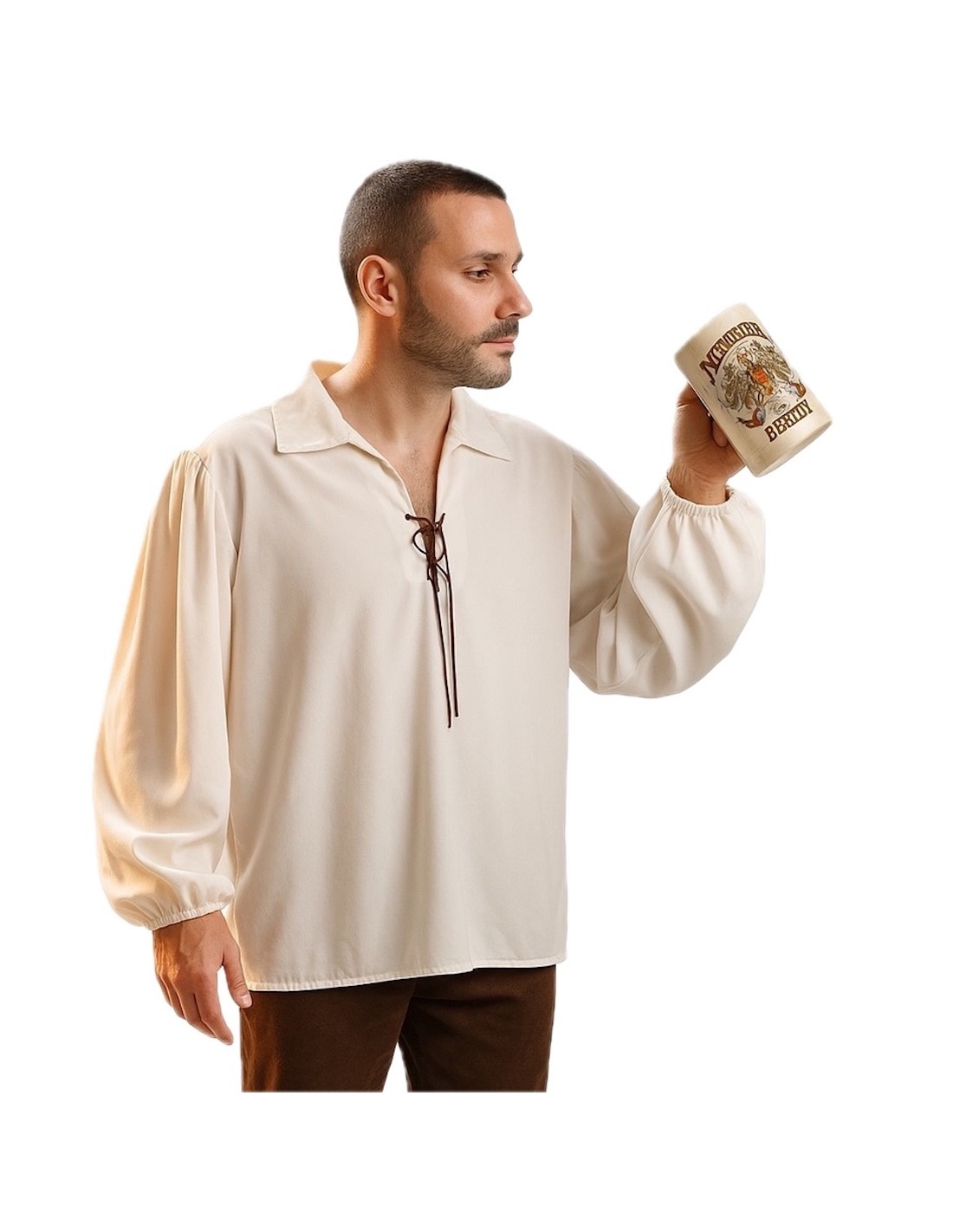 Esta atractiva camisa/ casaca medieval, de color blanco roto, está confeccionada en un resistente pero suave poliéster y presenta un corte recto. El cuello, tipo camisa, se cierra con cordón, tal y como era característico en la época medieval. Y las mangas se ajustan mediante elástico al puño.