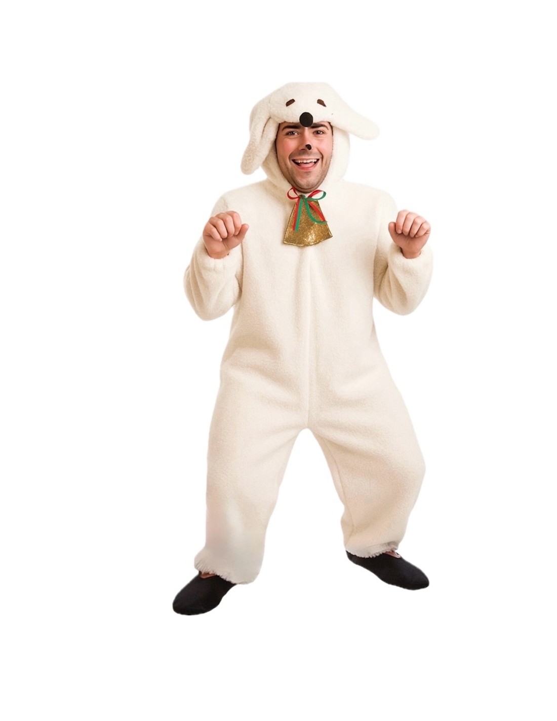 Este suave y amoroso traje consiste en un mono con capucha, confeccionado en suave y tupido poliéster con punto de borreguillo. Presenta en la parte delantera una cremallera de arriba a abajo, además de un adorno a la altura del cuello con forma de campana y lazos confeccionados en foam dorado. La capucha, cosida al mono, tiene dos orejas robustas y rígidas para mantener su forma. En la parte posterior, se encuentra un pompon a modo de cola.