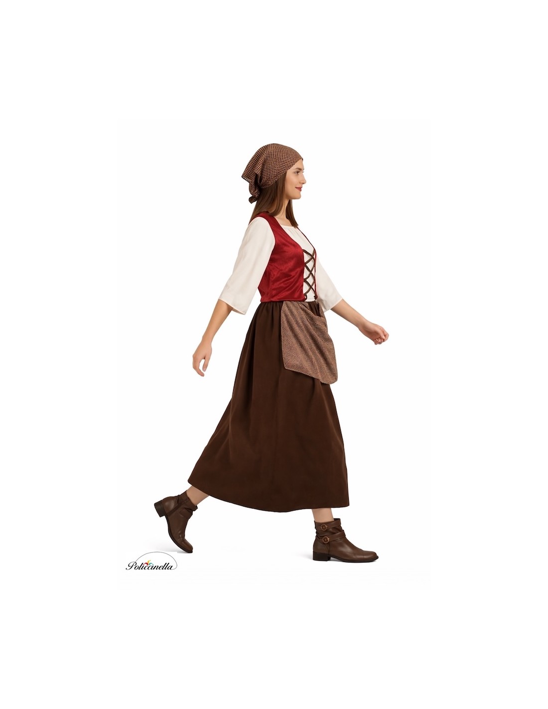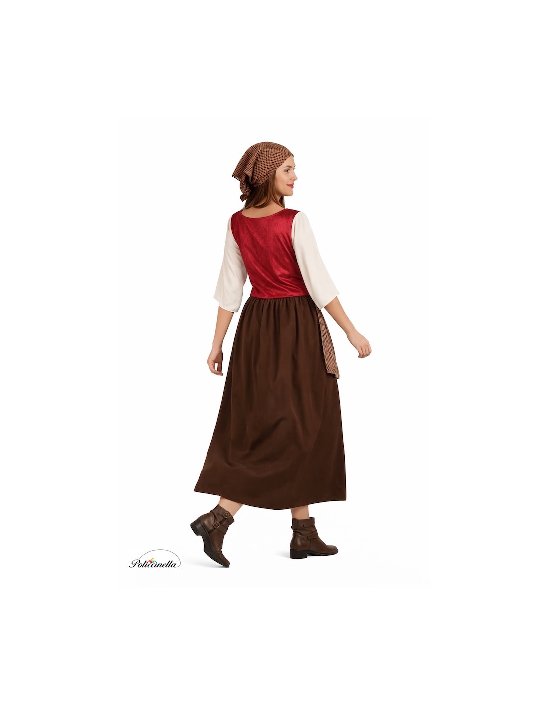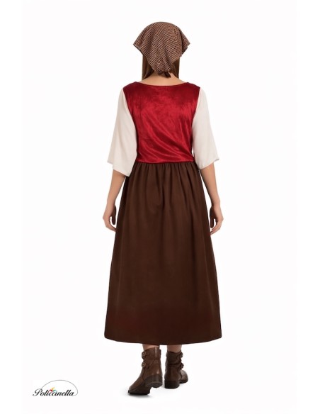 Este disfraz de mesonera se compone de una camisa de poliéster con manga al codo, sujeta por una goma. La camisa está adornada con puntillas y cuello barco con goma para sujetarse a los hombros. El chaleco, también de poliéster, presenta un cierre acordonado en la parte del pecho. La falda, de corte en A y confeccionada en un tejido amelocotonado, llega hasta el suelo y presenta una goma a la cintura. El disfraz se completa con un delantal confeccionado en una tela estampada de estilo antiguo y una pañoleta para el cabello tejida en la misma tela que el delantal.
