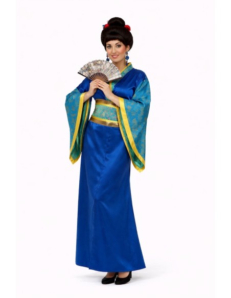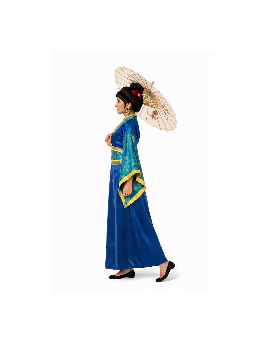 Precioso disfraz de geisha compuesto por kimono largo confeccionado en raso azul eléctrico, con cuello, mangas y pieza trasera en tejido similar al brocado con motivos florales y pieza en amarillo. El conjunto incluye un obi o cinturón ancho elaborado con la misma tela brocada, reforzado con material foanizado para aportar estructura. Va decorado con pasamanería dorada y se ajusta mediante lazada posterior. La pieza trasera evoca el tradicional cojín ornamental, aportando volumen y autenticidad al conjunto.