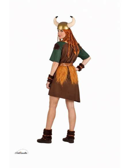 Este disfraz de vikinga presenta un vestido que combina una parte frontal confeccionada en poliéster y una parte trasera confeccionada en un suave punto de máquina semielástico. Incluye detalles en los hombros con pelito rizado marrón oscuro, al igual que las muñequeras y calentadores, ambos equipados con dos cintas marrones claras para lazadas decorativas. El escote en pico está rodeado de poliéster marrón claro que simula cuero, y destaca un círculo plateado en poliéster foanizado con pelo sintético cayendo desde él. Se complementa con un cinturón de poliéster marrón claro, también simulando cuero, del que cuelga pelo sintético.