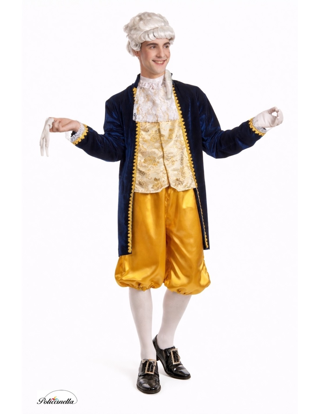 Disfraz estilo Luis XV compuesto por levita, pantalón corto y pañuelo de cuello. La levita combina terciopelo tupido con poliéster estampado tipo brocado dorado, decorada con pasamanería dorada y puntilla blanca en puños. Cierre frontal con velcro oculto para facilitar su uso sin alterar la estética. El pantalón, en raso brillante, incluye cintura y bajos elásticos para mayor comodidad, además de bolsillo interior funcional. Su largo, por debajo de la rodilla, mantiene la fidelidad histórica. El pañuelo de puntilla blanca completa el conjunto con coherencia y elegancia.