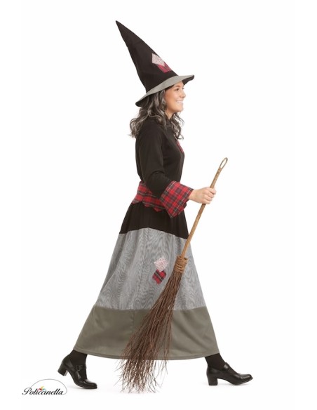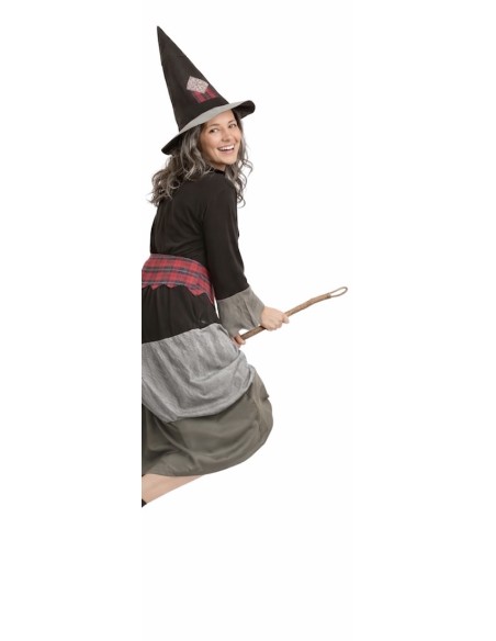 Se trata de un vestido confeccionado en suave punto de máquina semielástico combinado con poliéster. El cierre se realiza mediante un sistema de velcro en la parte posterior del cuello. El vestido presenta una decoración de piezas de tela que simulan remiendos y una lazada para ajustar la cintura por detrás. Se completa el traje con un característico sombrero de bruja confeccionado en la misma tela que el vestido y reforzado con filtro para darle cuerpo y estructura. El sombrero está decorado con los mismos motivos que el resto del traje.