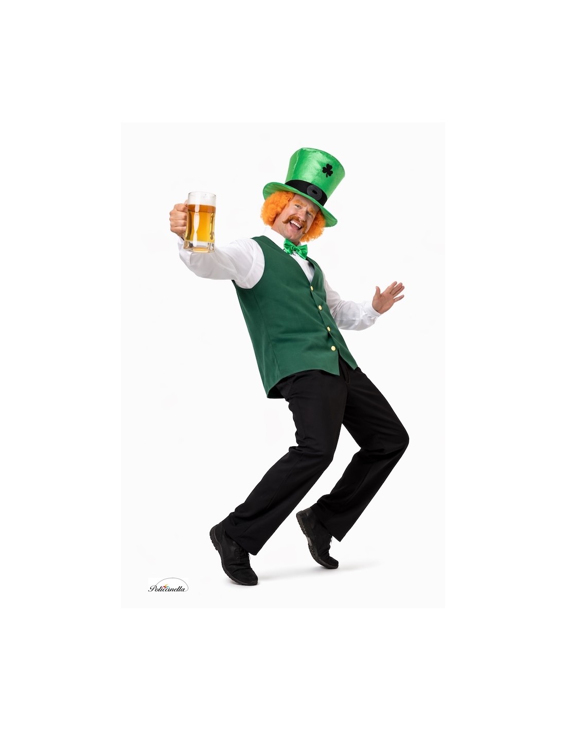 Divertido y cómodo traje compuesto por camisa de poliéster con chaleco integrado y cierre de velcro que simula dos piezas. Incluye pajarita de raso con elástico, pantalón de suave punto de máquina con cintura adaptable y el caracteristico gorro que representa el personaje, confeccionado en raso foanizado y revestido con filtro para darle cuerpo y estructura, evitando así su deformación, decorado con piezas de filtro